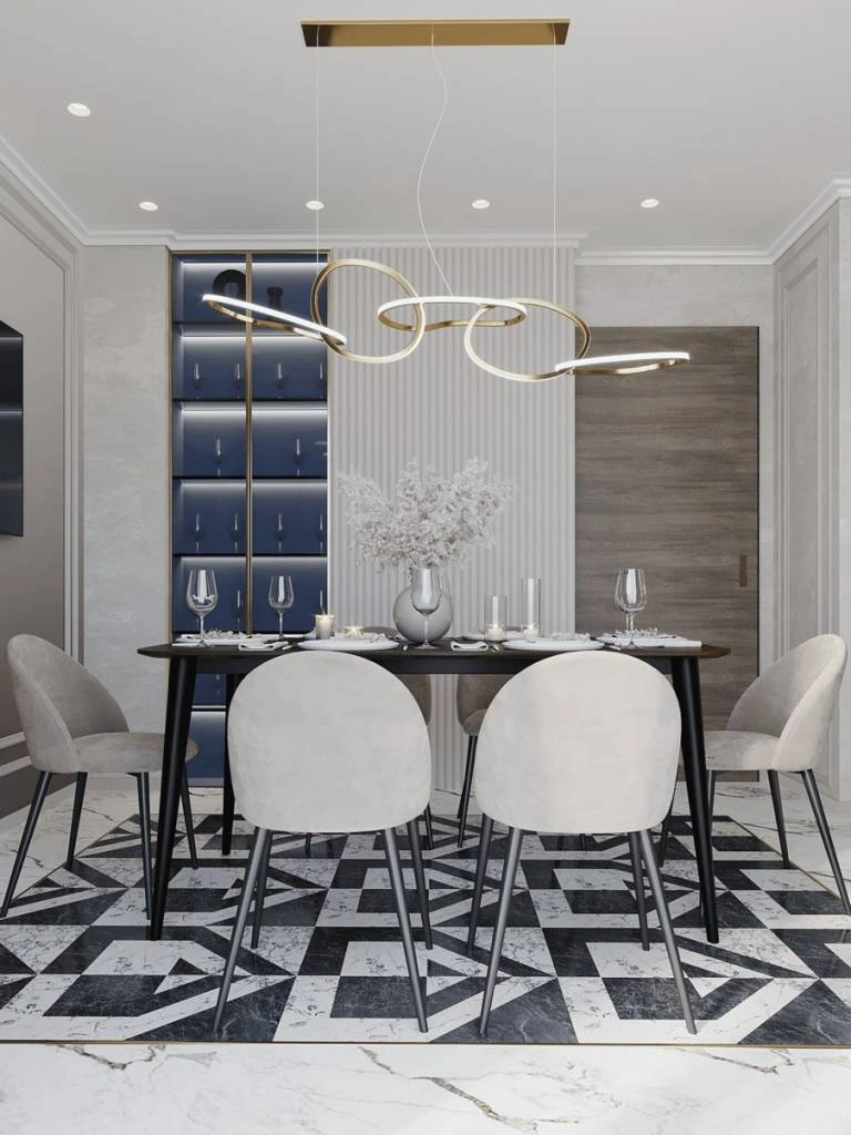 Хорошо, когда осветительные приборы перекликаются со столом по форме. Например, к округлой столешнице подойдет светильник с мягкими, изогнутыми очертаниями, а квадратную дополнит геометричный подвес.