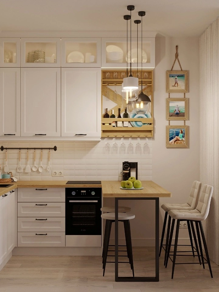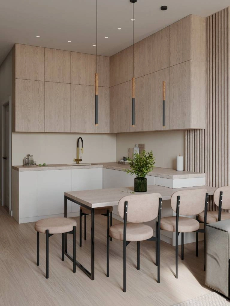 Освещение в обеденной зоне помогает создать комфортную, домашнюю атмосферу в месте приема пищи. Оно визуально выделяет эту часть кухни, тем самым делит пространство на части.