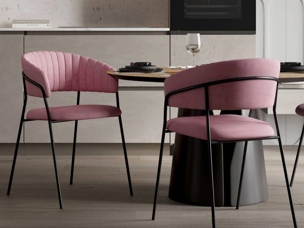В сезоне 2024 года стоит присмотреться к розовым (пудровым) стульям. Он нежный и женственный. Стулья такого цвета будут к месту на белой, черной кухне. В сочетании с фиолетовым, зеленым и синим, розовый обретает оригинальность.