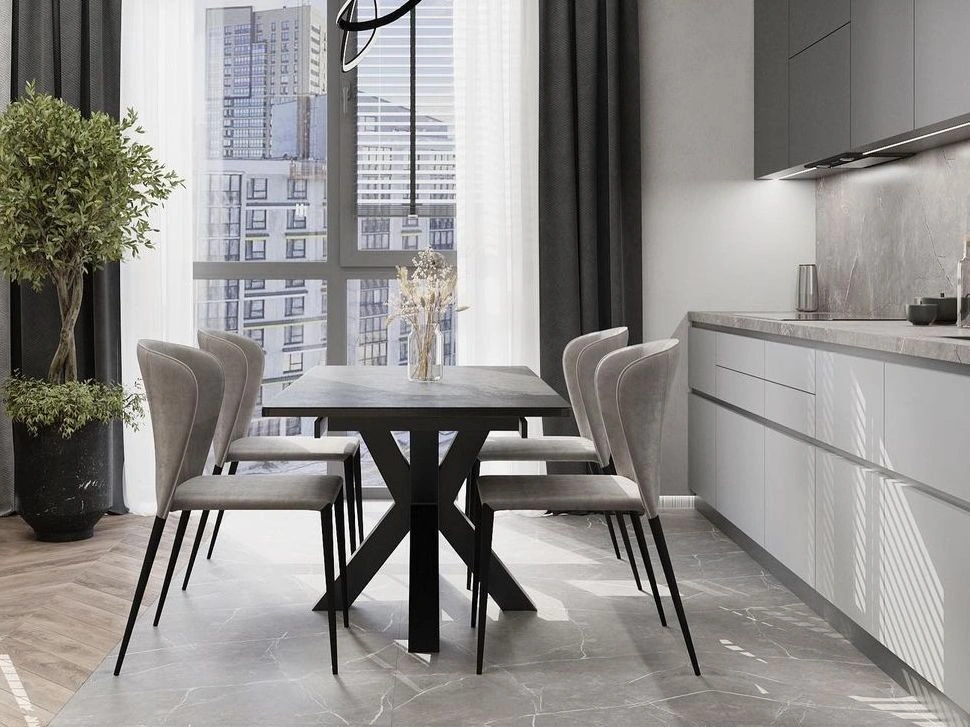 Ткань ощущается привычной в качестве обивки для стульев обеденной группы. Рогожка, бархат или велюр — наиболее популярные варианты среди наших клиентов. Кстати, в среднем ценовом сегменте, стулья в бархатной обивке победили рогожку. Визуально более дорогой, легок в уходе, и не боится даже когтей котика (только стриженых!).