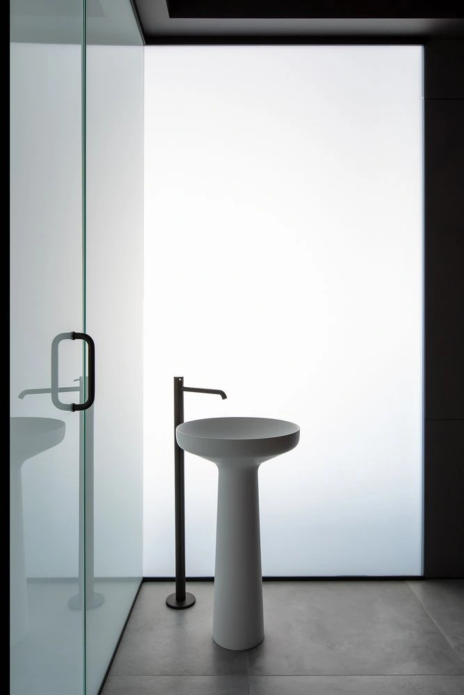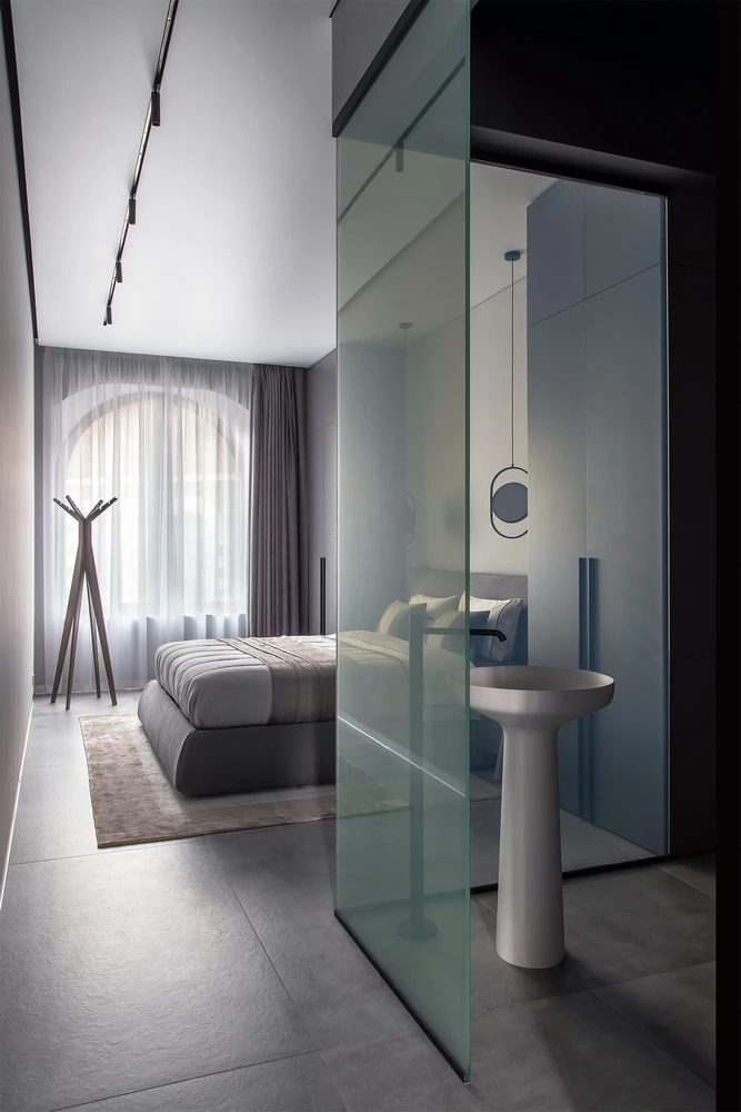 Приват-зона хозяина дома оборудована мастер-санузлом. Изначально он был скрыт глухой перегородкой, а в спальню вел узкий коридор. В итоге перепланировки стену заменили смарт-стеклом с возможностью регулировки уровня прозрачности. Это смелое решение добавило воздух и значительно расширило пространство. Все необходимые аксессуары и зеркало спрятаны здесь во встроенные шкафы. Раковину в этом интерьере можно отнести к предметам искусства, но она не потеряла своего бытового предназначения. Квартира жилая и содержится владельцем в идеальном порядке.