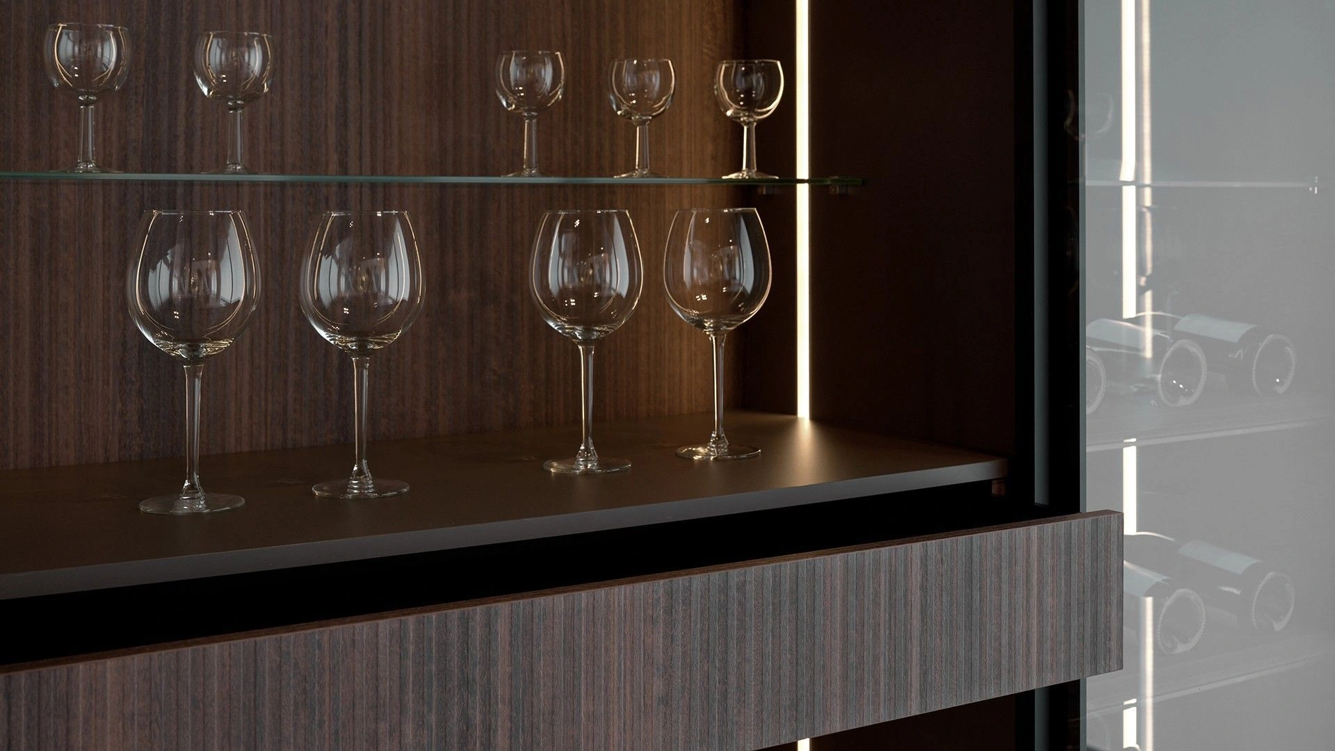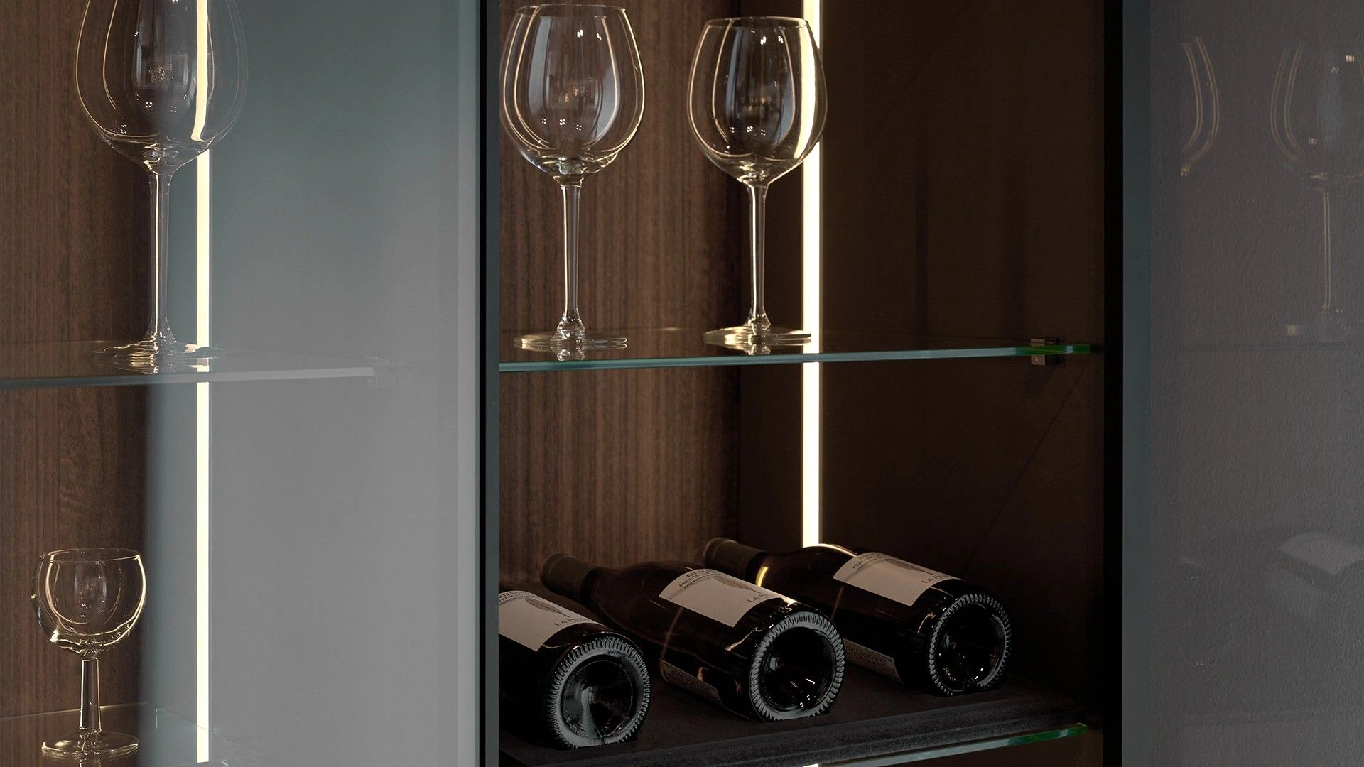 Стеклянная витрина Frame — это стильное и функциональное дополнение к кухонной мебели. Она не только позволяет вам выставить посуду, декор и вино, но и добавляет свет и объем в пространство. Витрина комплектуется полками для вина— это не только практичное решение для хранения бутылок, но и элегантный способ продемонстрировать свою коллекцию. Встроенная подсветка в витрину становится настоящим акцентом в интерьере, особенно в вечернее время.