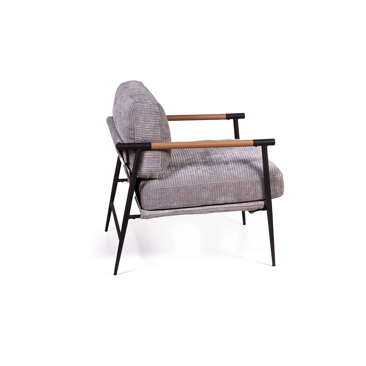 Прочный черный металлический каркас гарантирует долговечность и надежность, а подлокотники из металла под дерево придают креслу особый шарм. Торцы из матового металла добавляют современный штрих. Данная модель легко впишется в интерьеры в стилях: лофт, модерн, современный, эклектика, фьюжн.