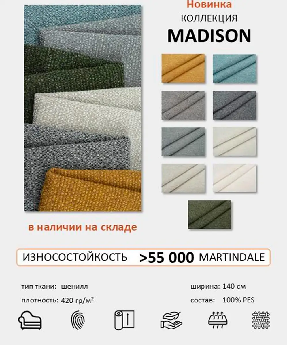 Выбирайте любую: от рогожки до натуральной кожи, в благородных цветах и фактурах, и конечно, с безупречными эксплуатационными характеристиками. Мы понимаем, чего лишены покупатели в интернет-магазинах, поэтому предлагаем доставку понравившихся образцов тканей к вам домой курьером до двери!