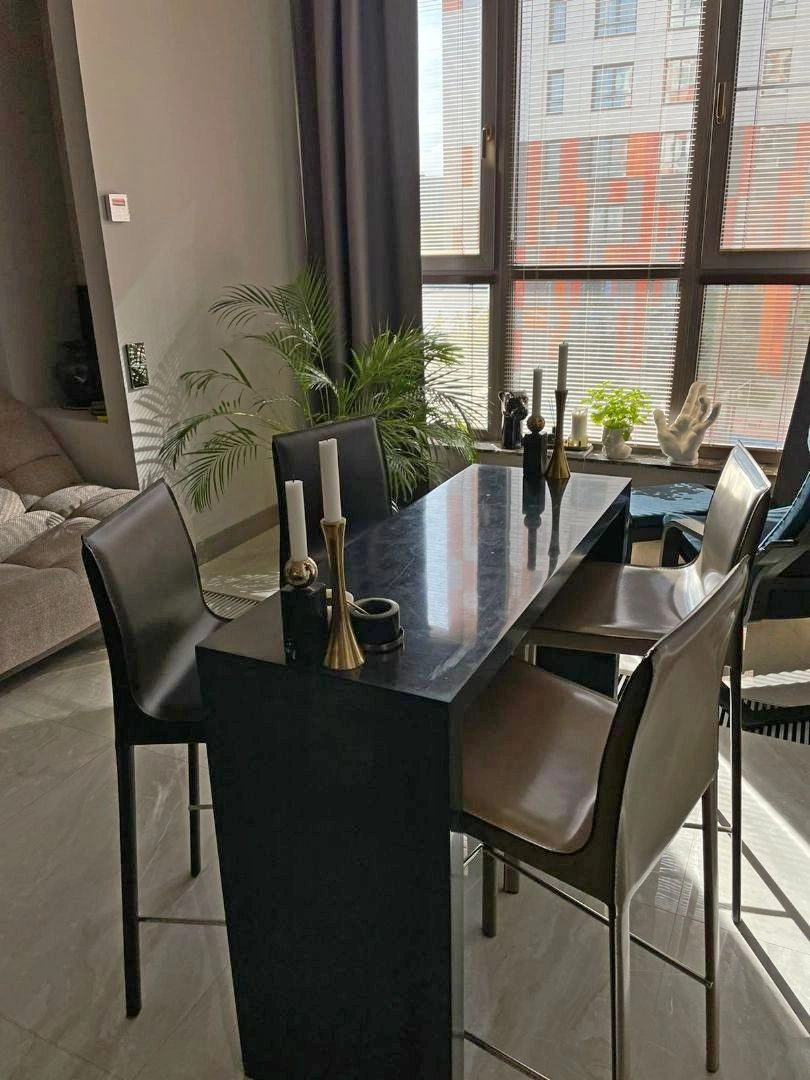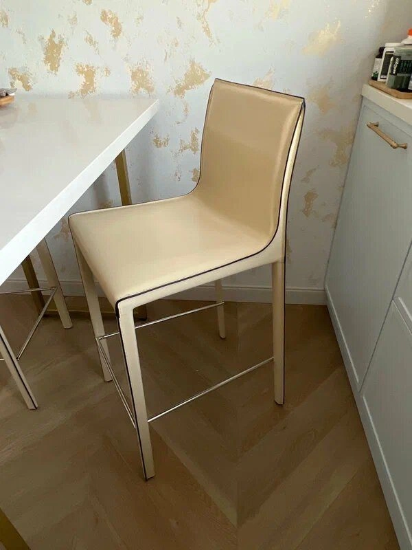 Крепкие металлические ножки скрыты под натуральной кожей такого же цвета, как и сам стул, благодаря этому создается лаконичный образ единого целого. На ножках предусмотрены хромированная подставка для ног и специальные пластиковые накладки, которые придают полубарному стулу дополнительную устойчивость и защищают полот царапин.