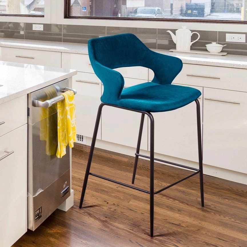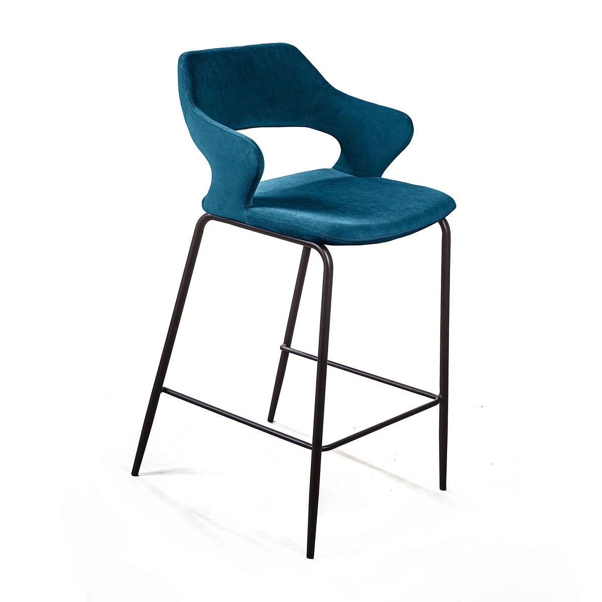 Полубарные стулья с идентичной формой сиденья как-бы парят в воздухе, благодаря тонким, но очень прочным ножкам. Очертания опорной перекладины с прямыми углами подчеркивают футуристичность верхней части, мягкой во всех отношениях.