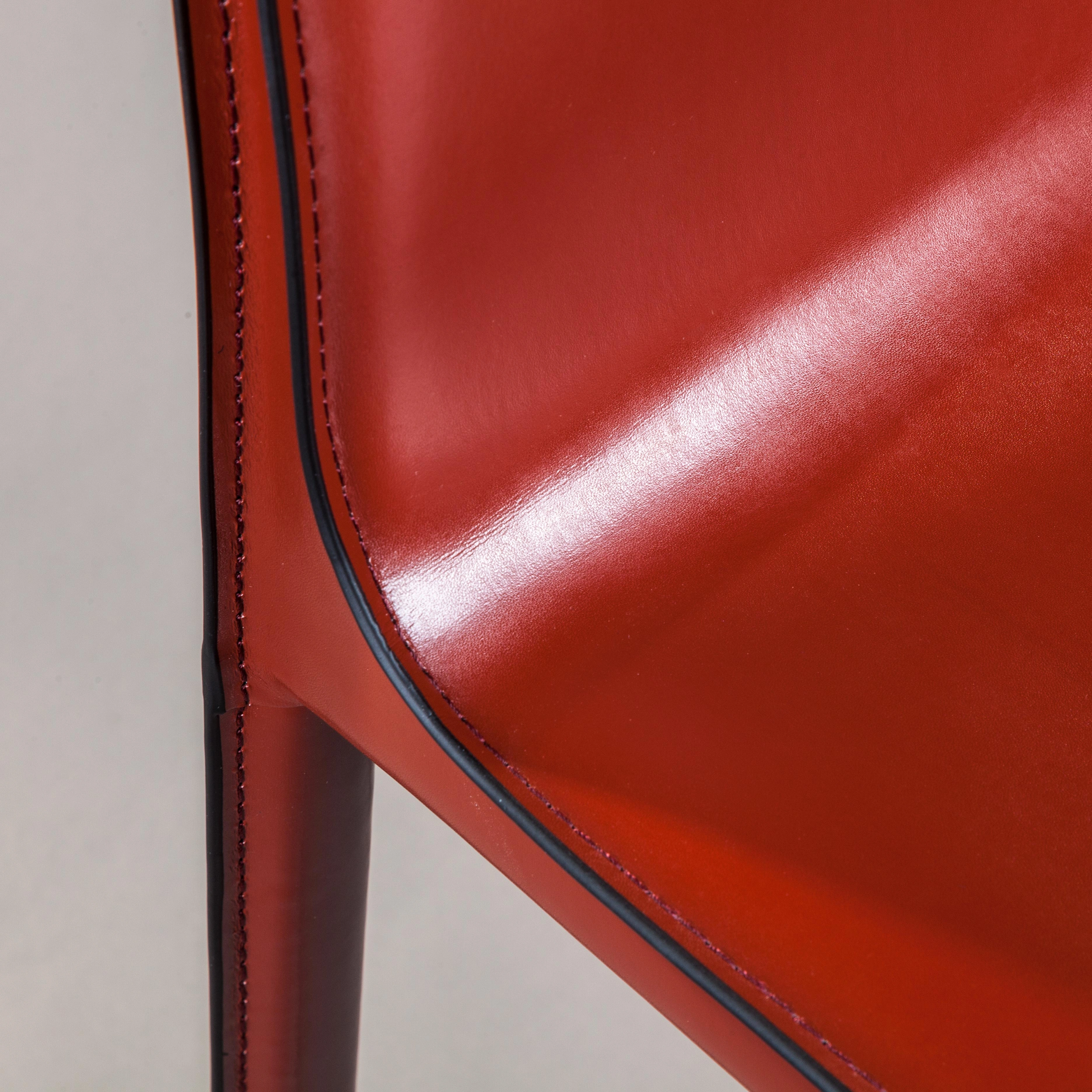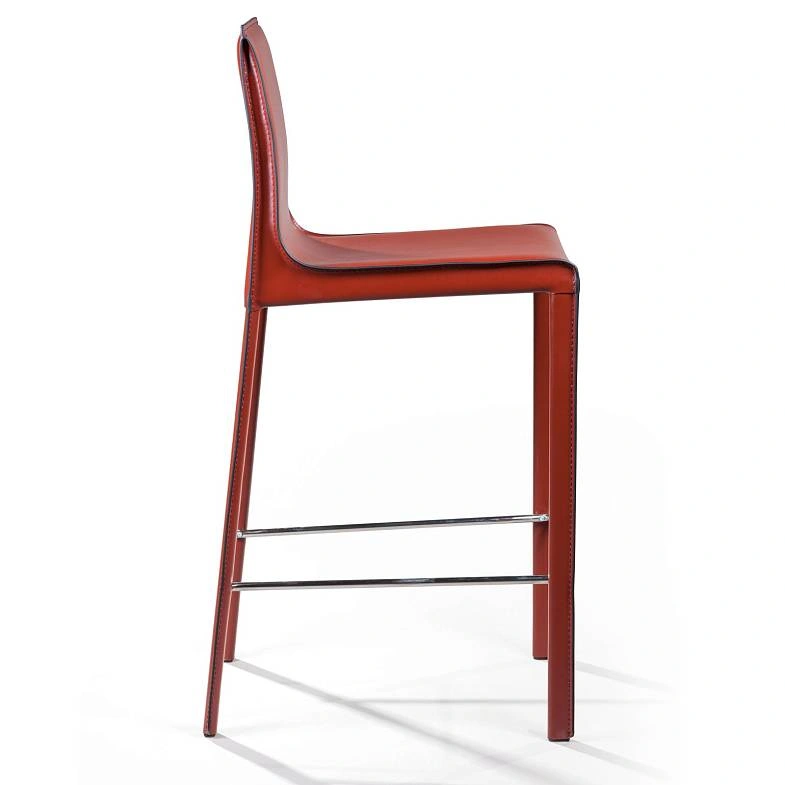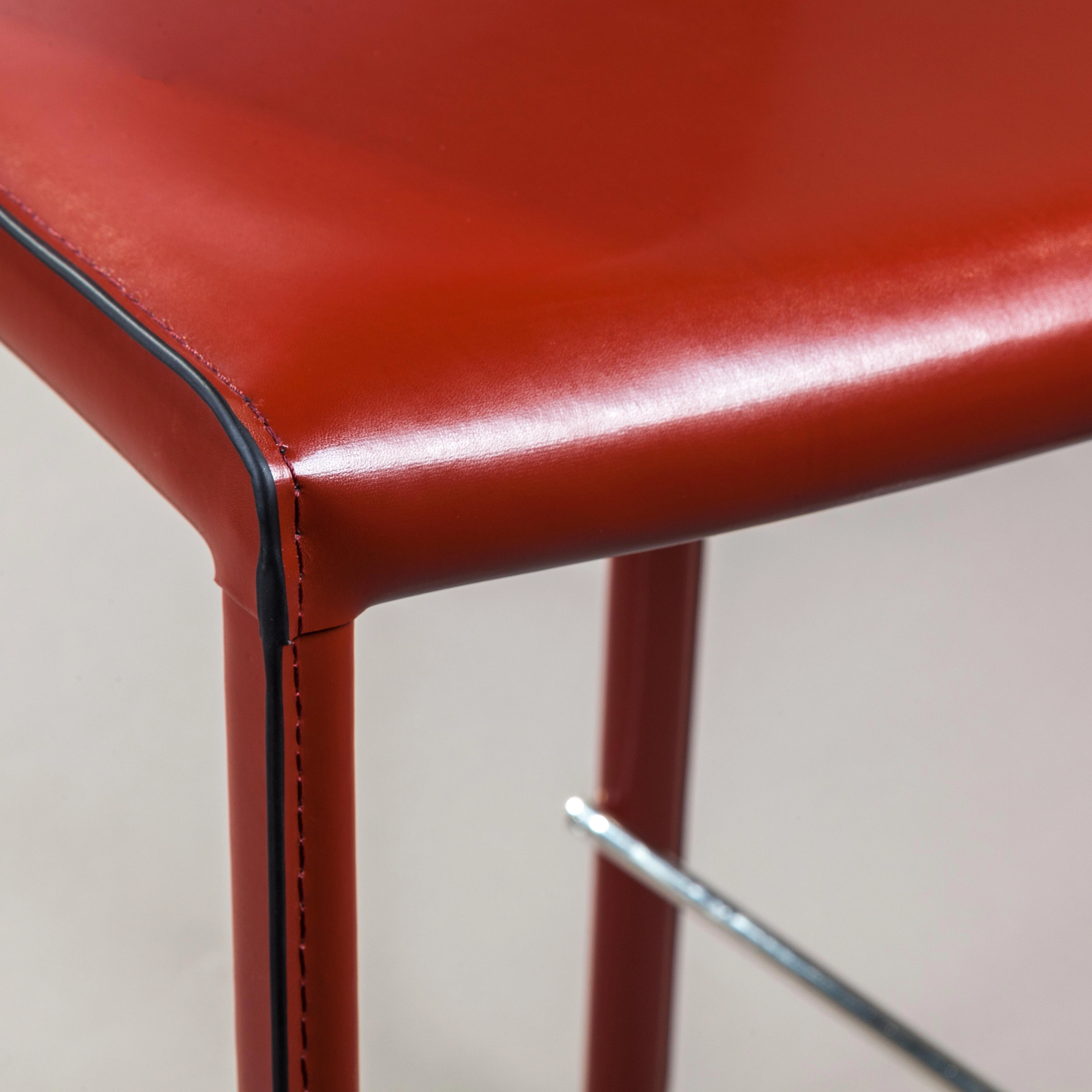 Крепкие металлические ножки скрыты под натуральной кожей такого же цвета, как и сам стул, благодаря этому создается лаконичный образ единого целого. На ножках предусмотрены хромированная подставка для ног и специальные пластиковые накладки, которые придают полубарному стулу дополнительную устойчивость и защищают полот царапин.