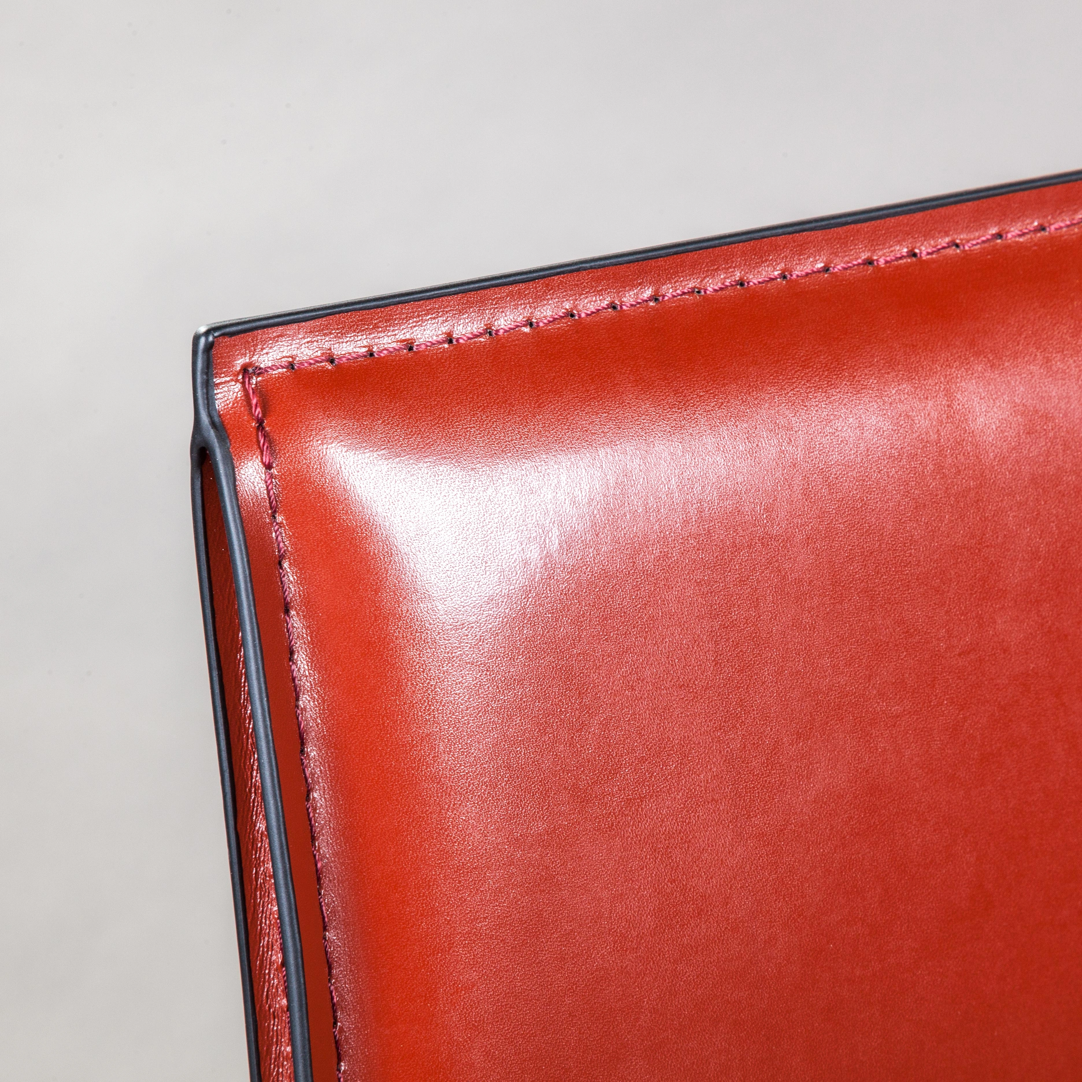 Обивка стула выполнена в регенерированной коже – обивочном материале, который сделан путём переплетения расщеплённых волокон натуральной кожи. В состав модифицированной кожи также входят полимеры и специальные дубильные добавки.