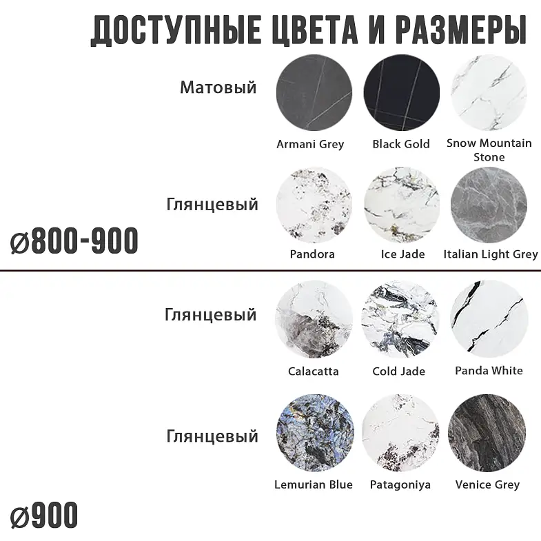 - в 12-ти популярных декорах керамики (для стола D900 мм): Armani grey, Black gold, Snow mountine stone, Calacatta, Cold jade, Ice jade, Italian light grey холодный, Lemurian blue, Panda white, Pandora, Patagoniya, Venice grey.