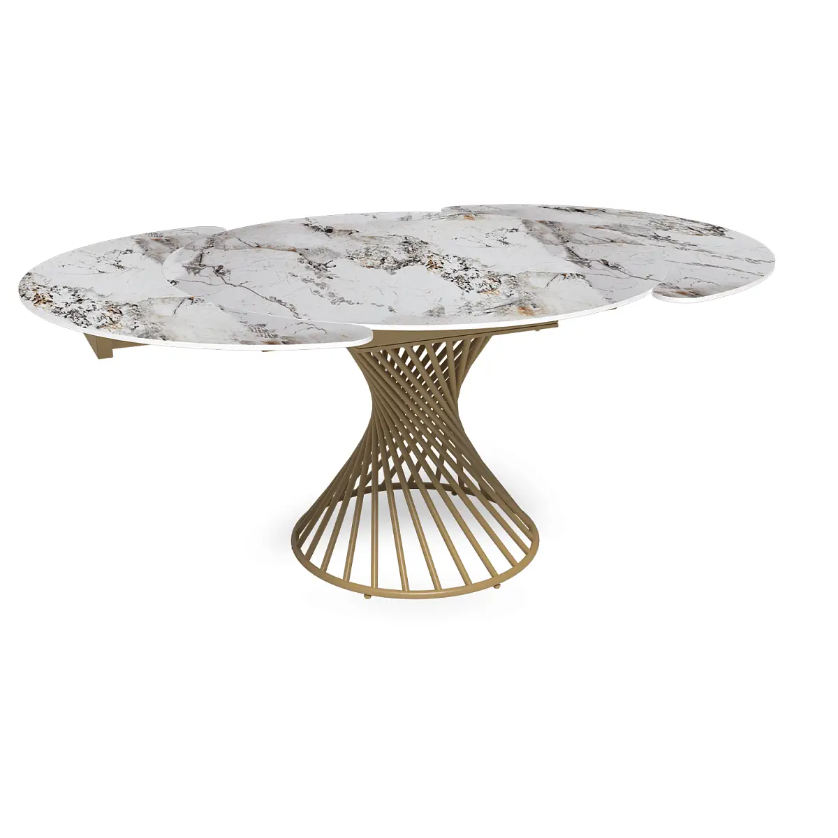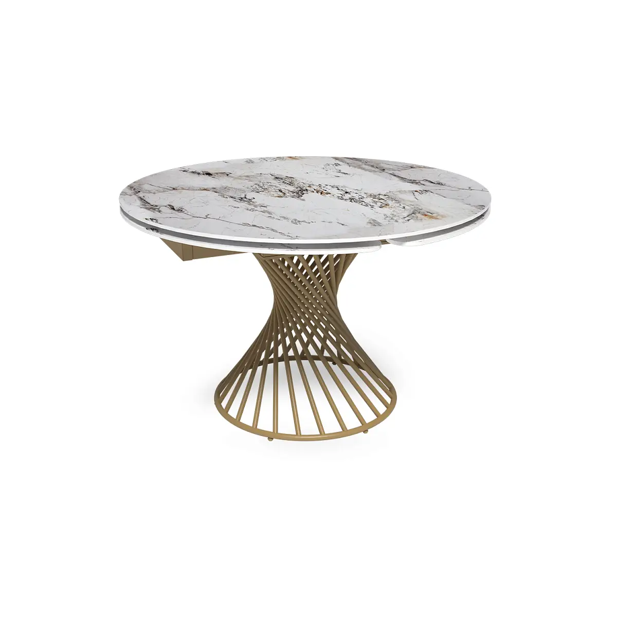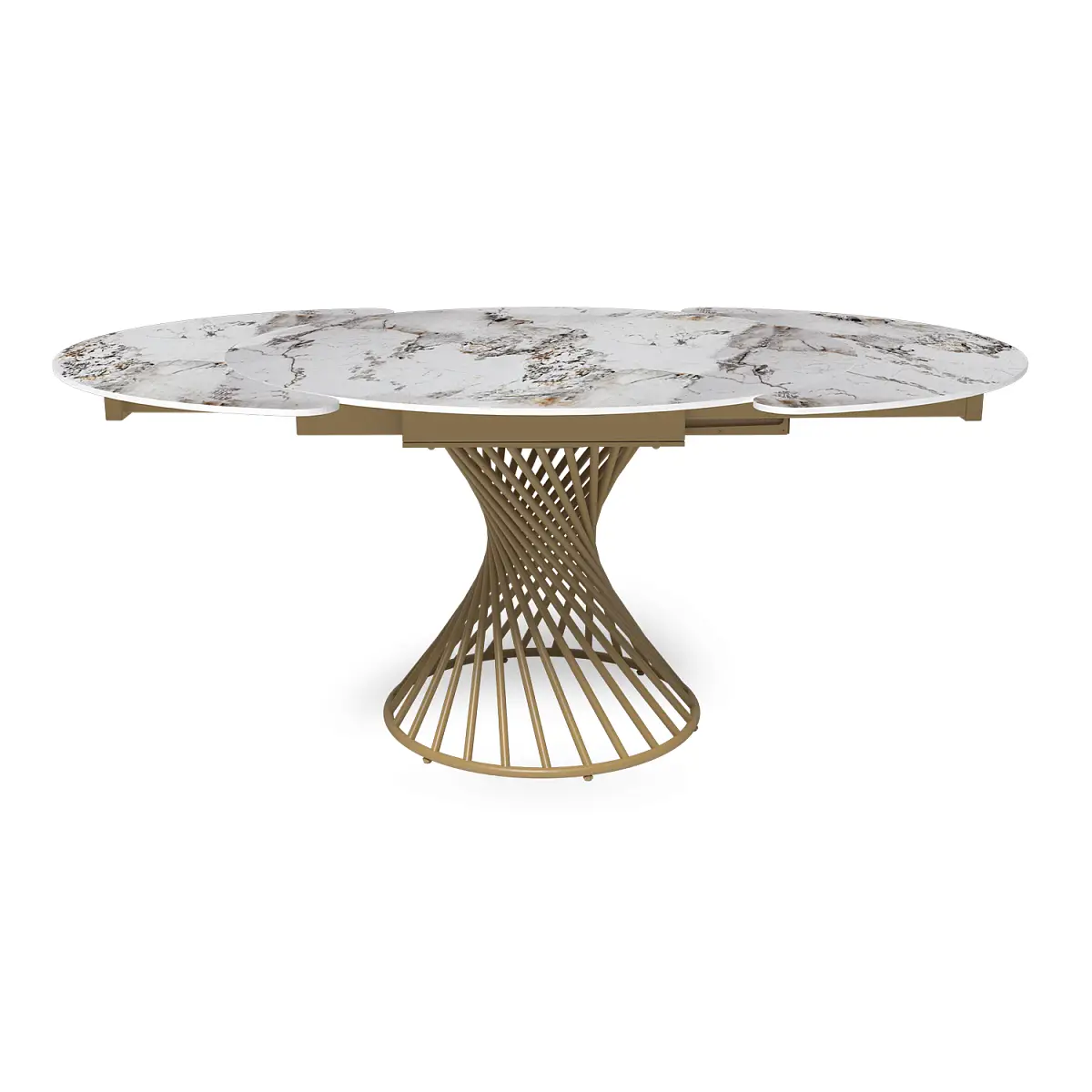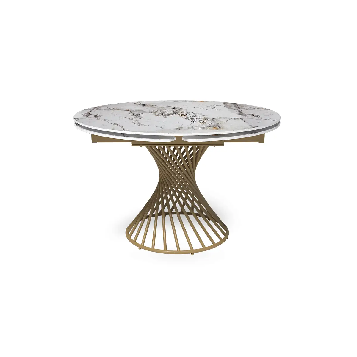 Стол имеет диаметр 120 см в стандартной конфигурации и расширяется до 180 см, благодаря уникальной двойной раскладке, обеспечивая посадку до 10 человек — идеальный выбор для больших встреч или семейных ужинов.