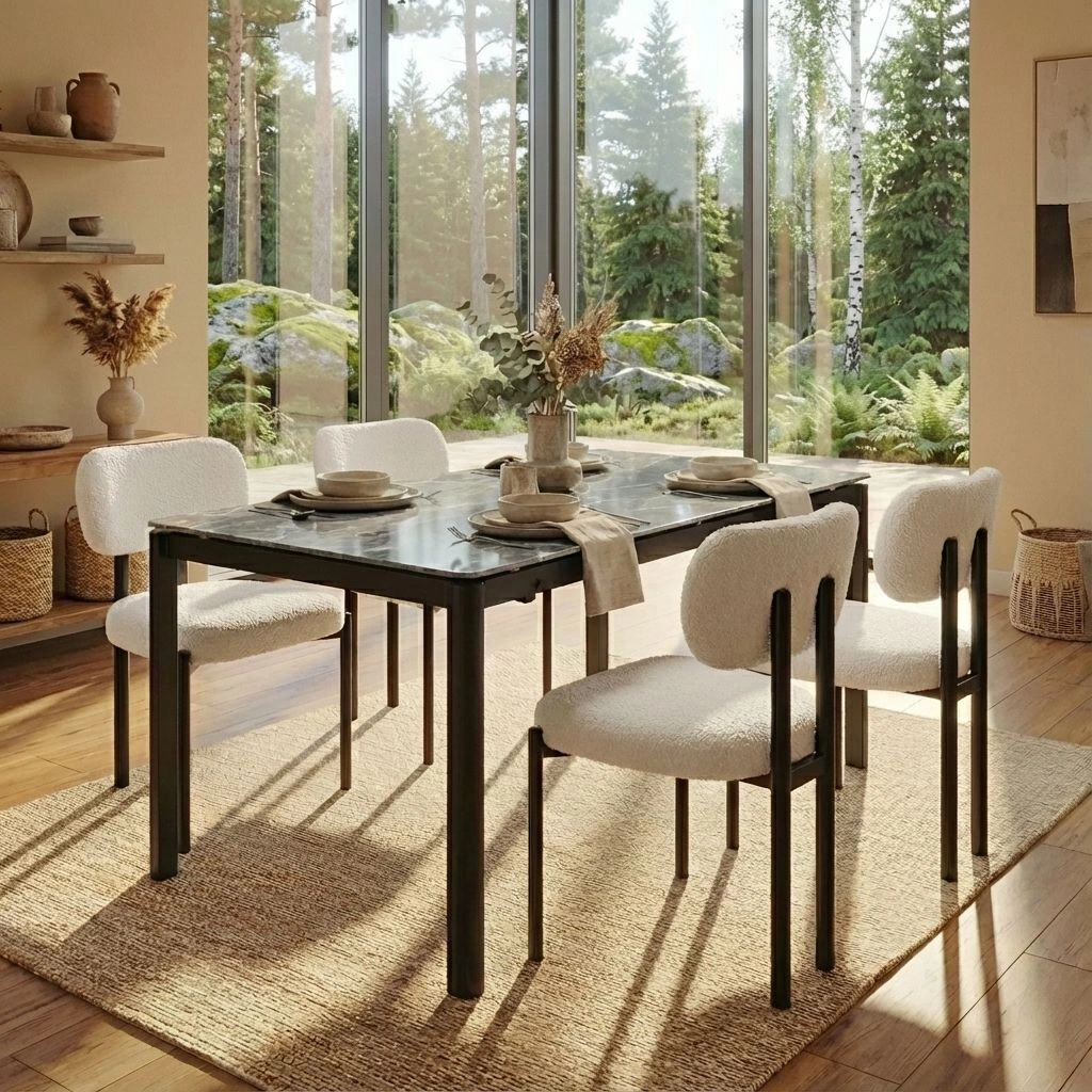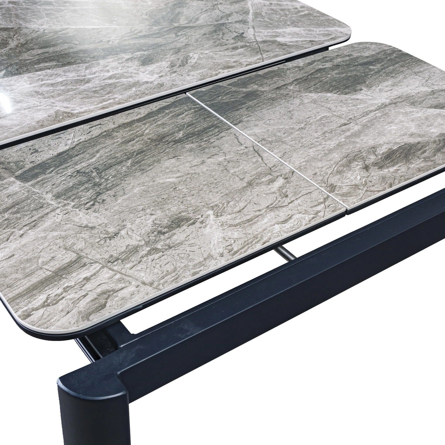 Яркий и притягательный стол Alpha выглядит невероятно стильно за счет контрастного сочетания основательных металлических опор черного матового цвета и керамической столешницы с ее неповторимым рисунком.