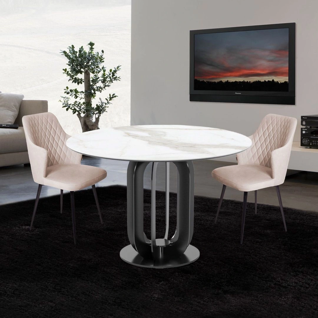 Столешница стола Castro имеет идеальную круглую форму, выполнена из МДФ толщиной 19 мм и покрыта керамикой 6мм. Это придает столу изысканный вид и приятную тактильность.