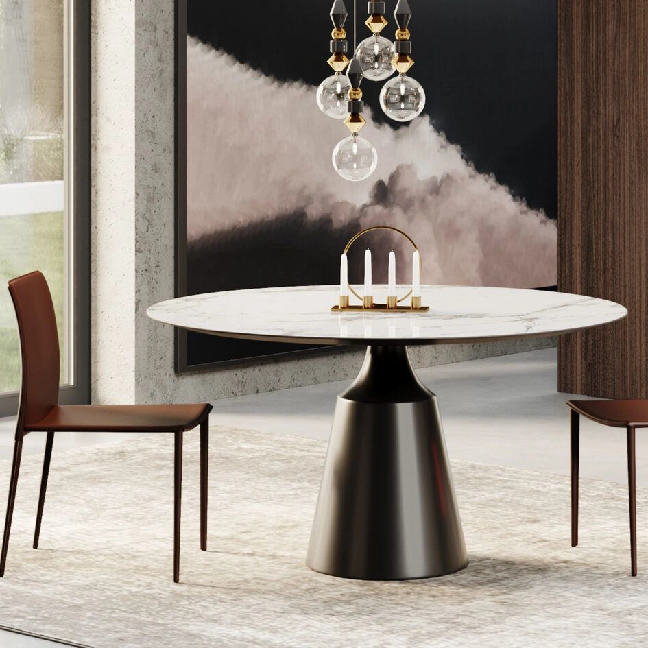 Основание состоит из центрального конусного ствола, выполненного из нержавеющей стали и соединением с узкой и отступающей столешницей, как бы напоминающей длинную элегантную шею, поддерживающую столешницу. Опоры могут быть выполнены в цвете золото или классическом черном.