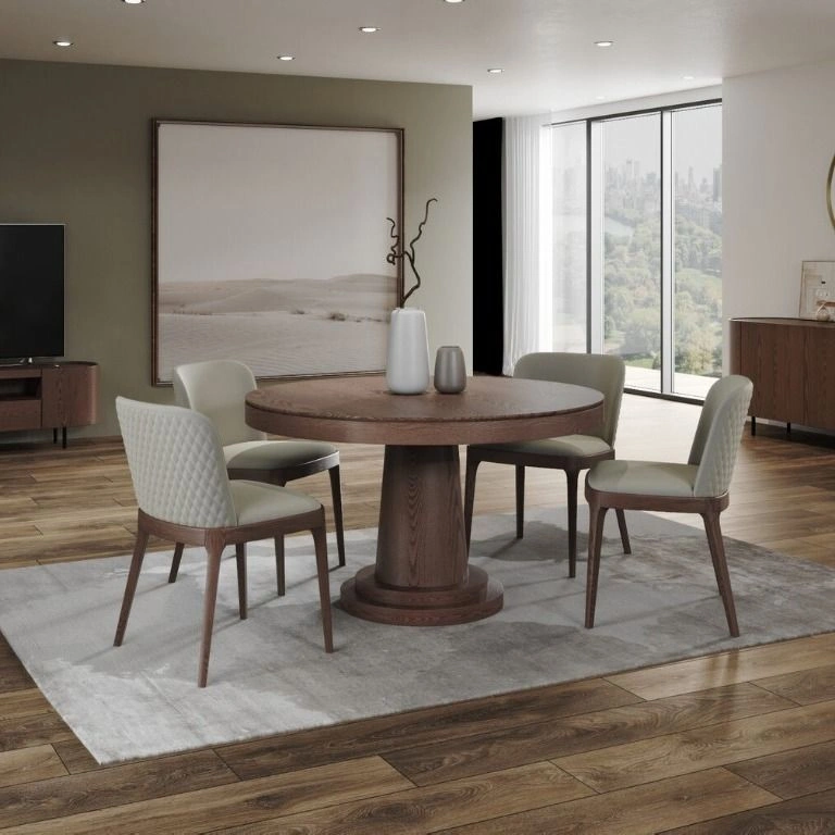 Стол Bilbo с круглой столешницей, не раскладывающийся, представляет собой элегантное и удобное решение для обеденной зоны. Столешница выполнена из шпона толщиной 1 мм, что придает ей стильный и современный вид. Опора стола выполнена из МДФ с натуральным шпоном, что придает конструкции прочность и устойчивость.