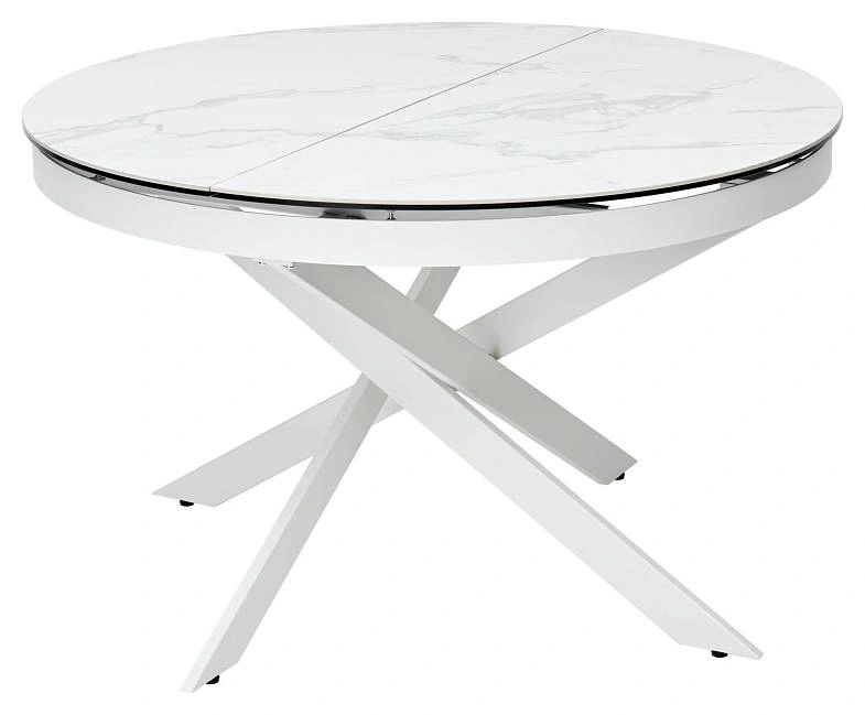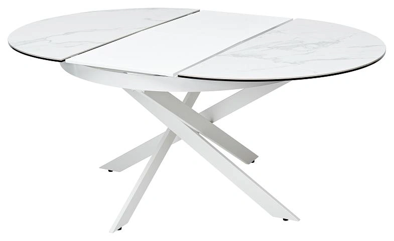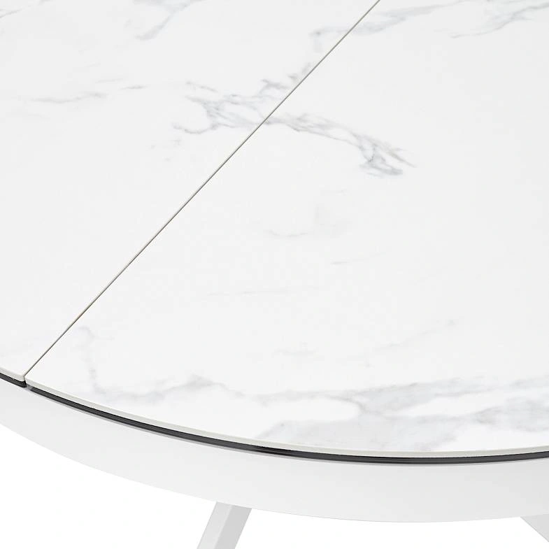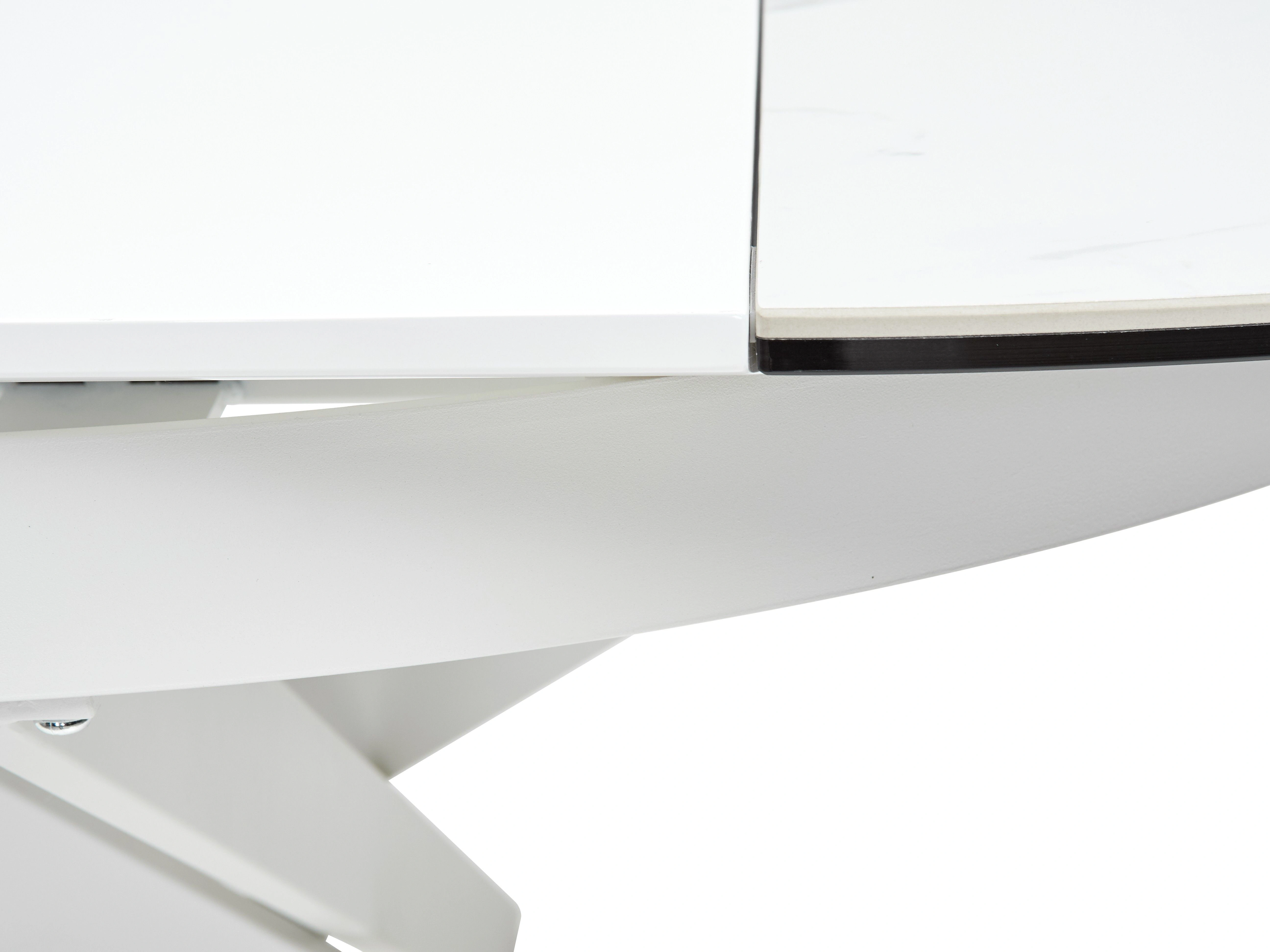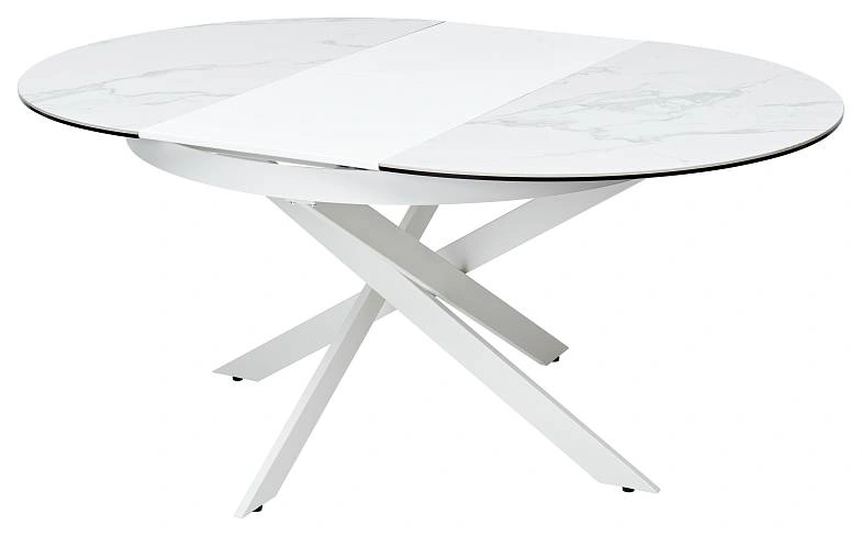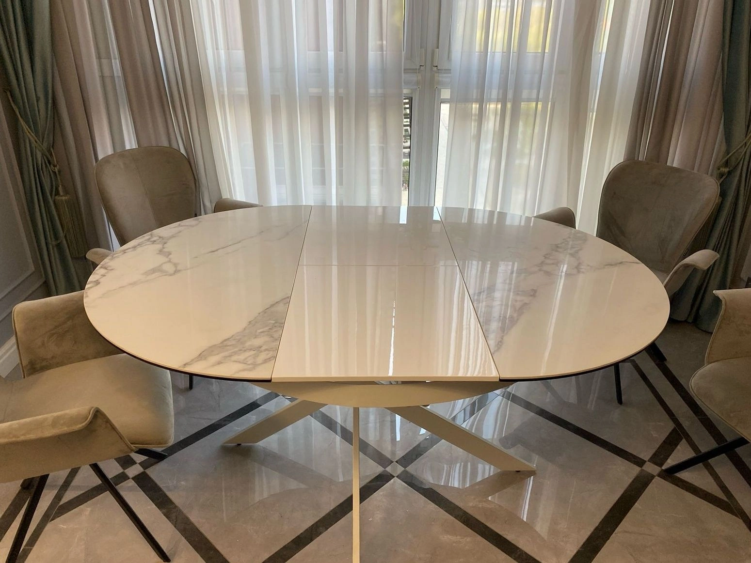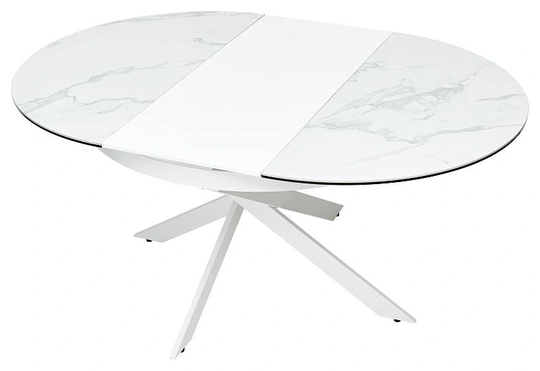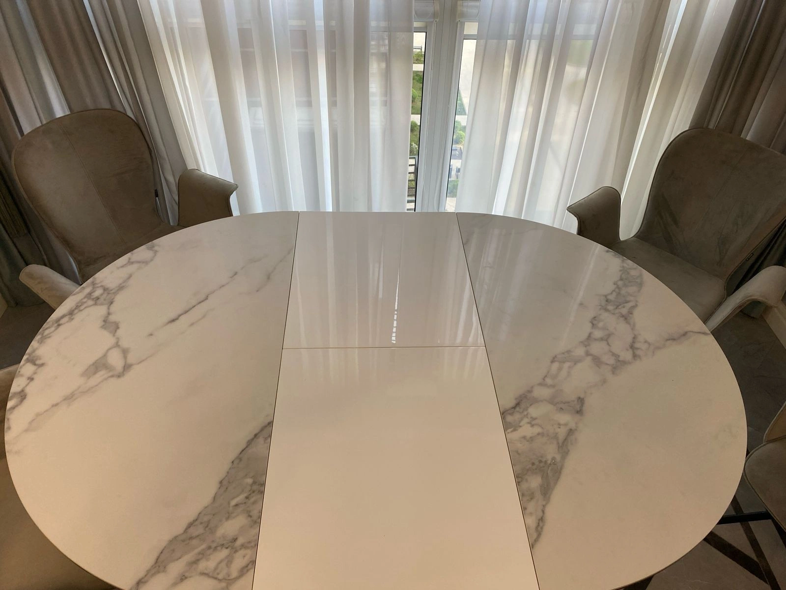 Керамика на стекле, глянец, толщина столешницы 13,5 мм (5,5 мм керамика + 8 мм стекло), не царапается, не впитывает загрязнения, термостойкая. Простая система раскладывания, вставка-бабочка, выполненная из МДФ в белом цвете, позволяет увеличить длину столешницы до 170 см.