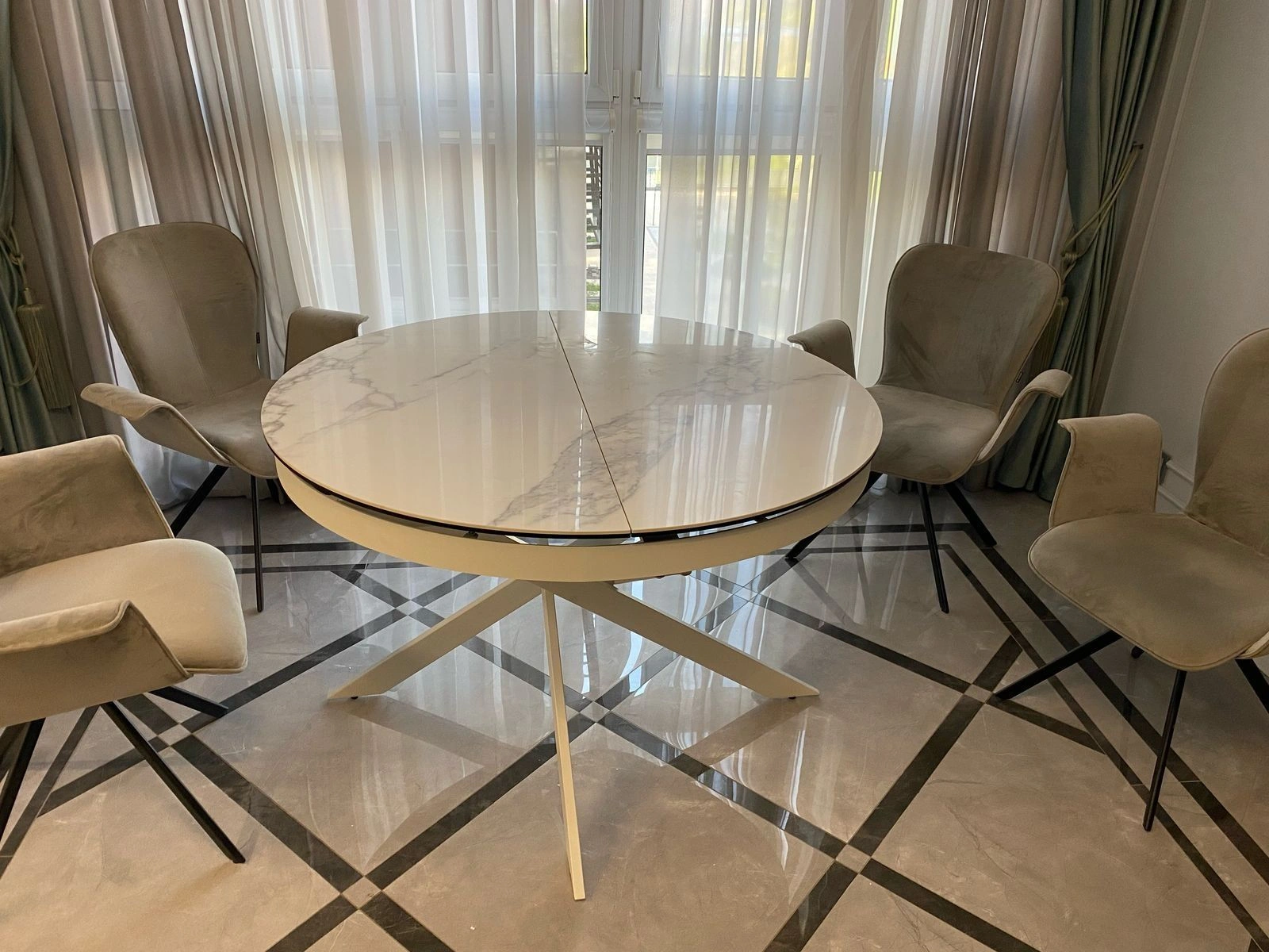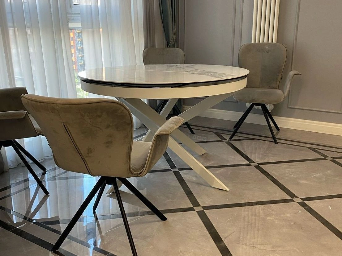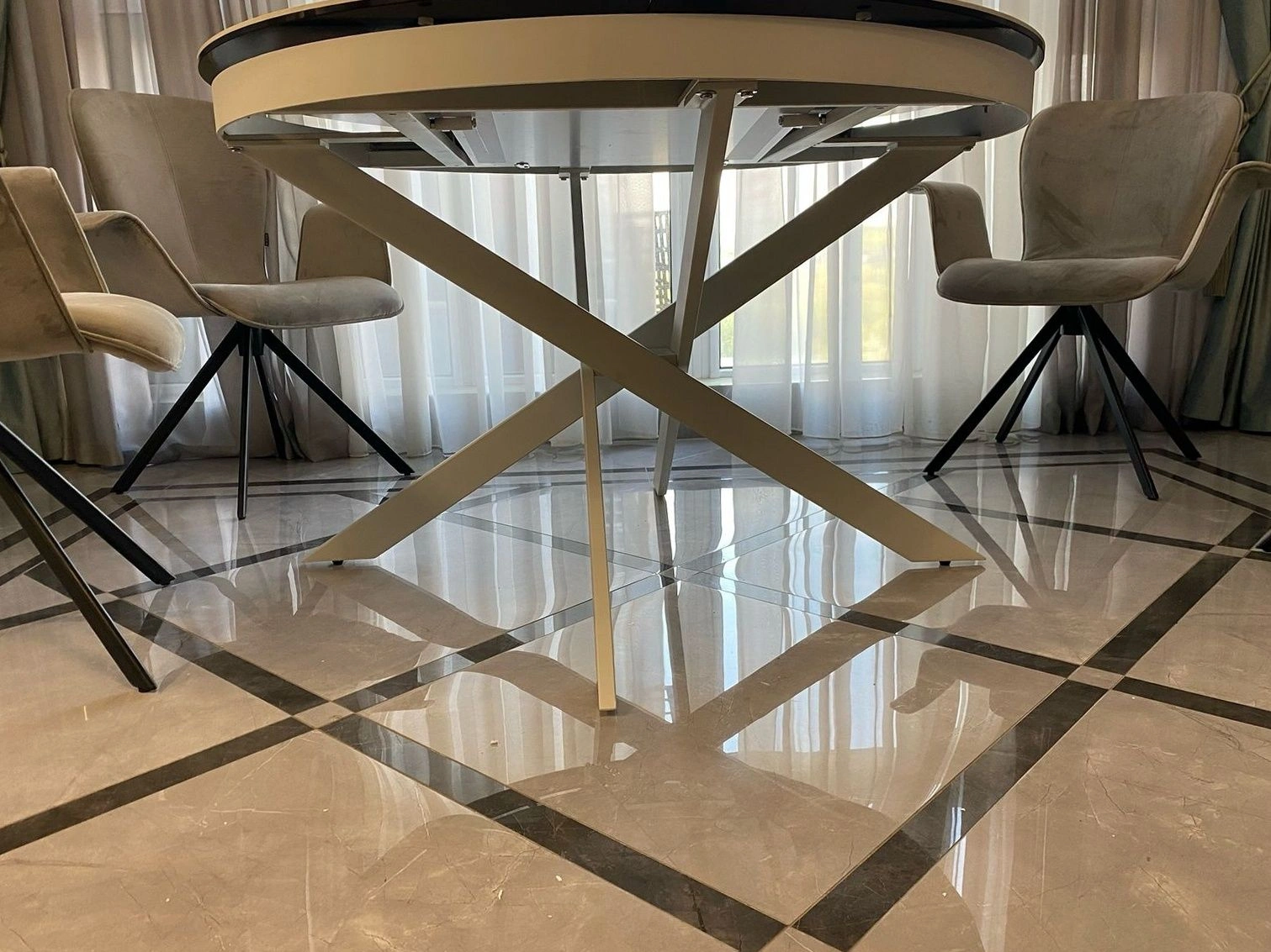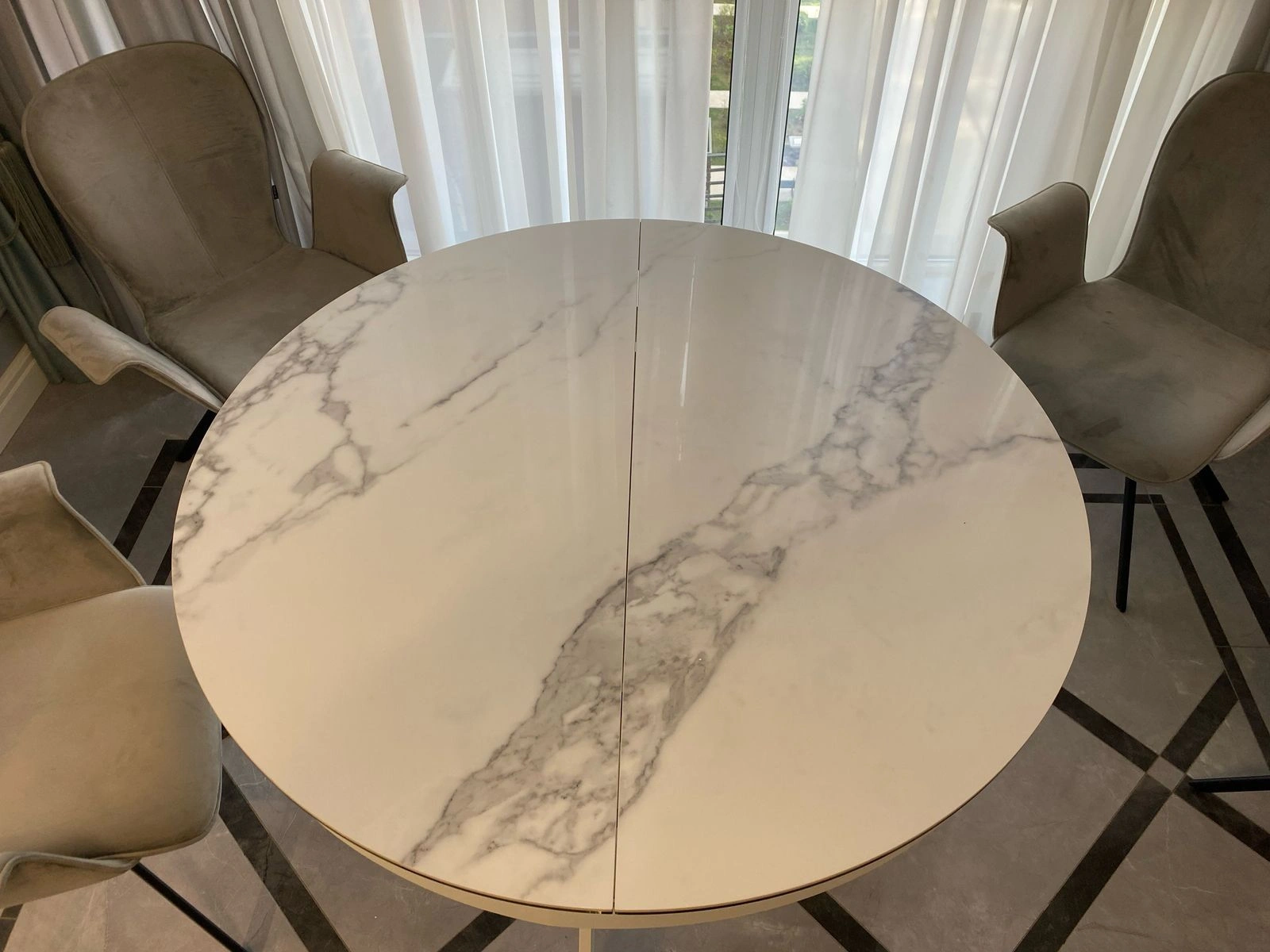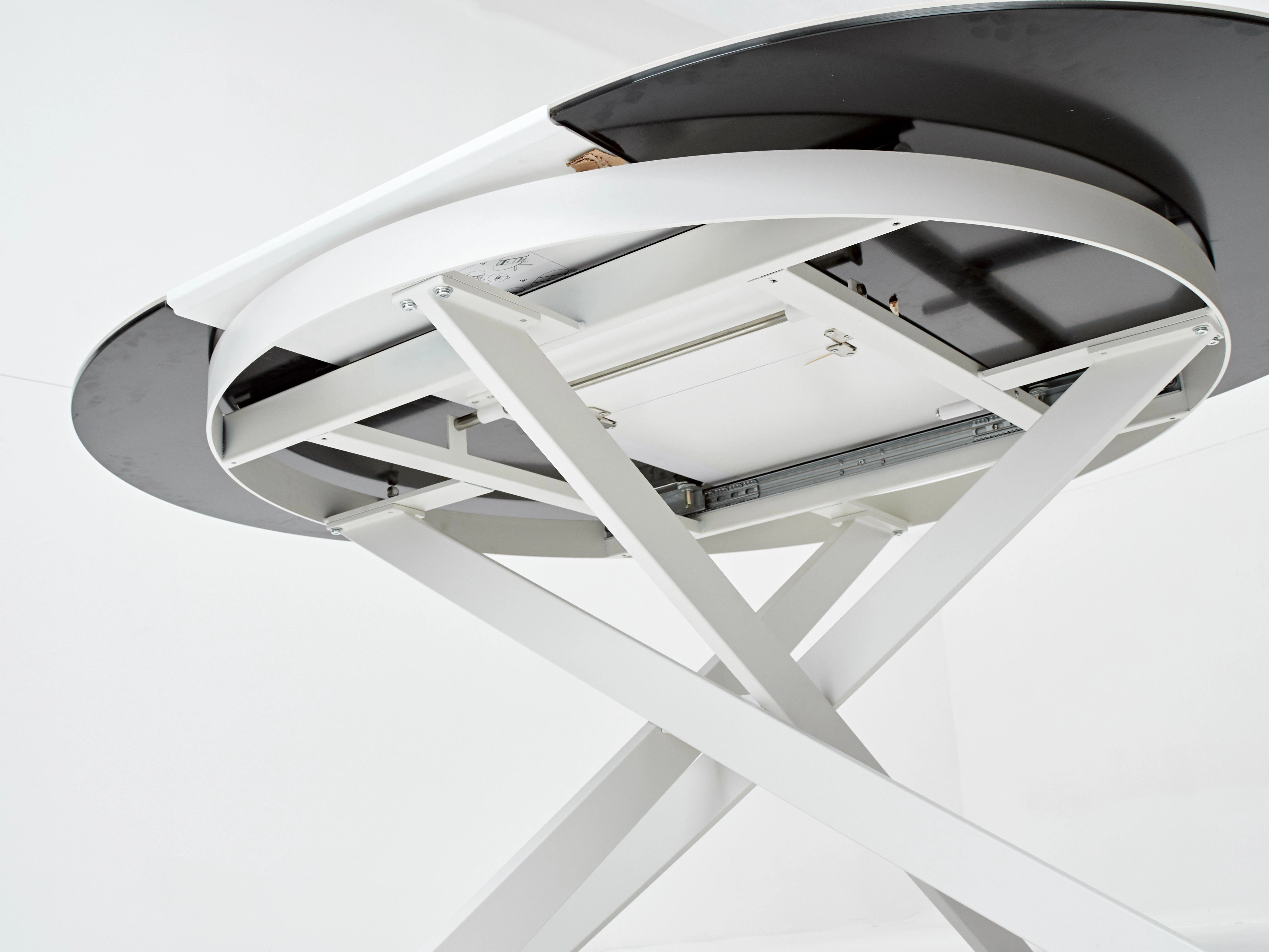 Керамика на стекле, глянец, толщина столешницы 13,5 мм (5,5 мм керамика + 8 мм стекло), не царапается, не впитывает загрязнения, термостойкая. Простая система раскладывания, вставка-бабочка, выполненная из МДФ в белом цвете, позволяет увеличить длину столешницы до 170 см.