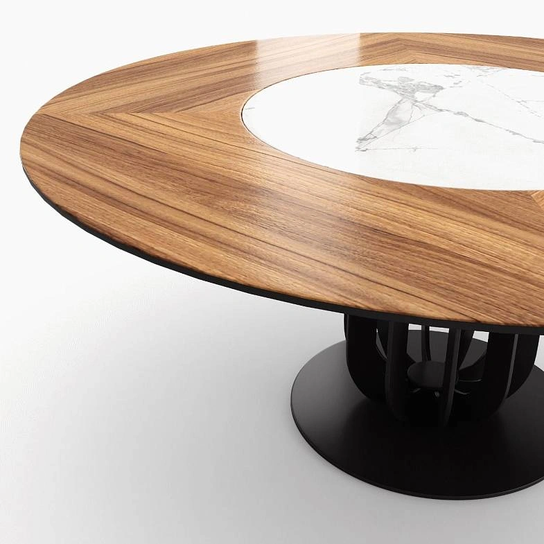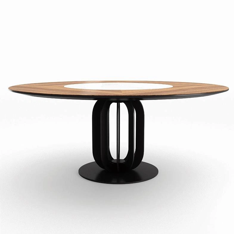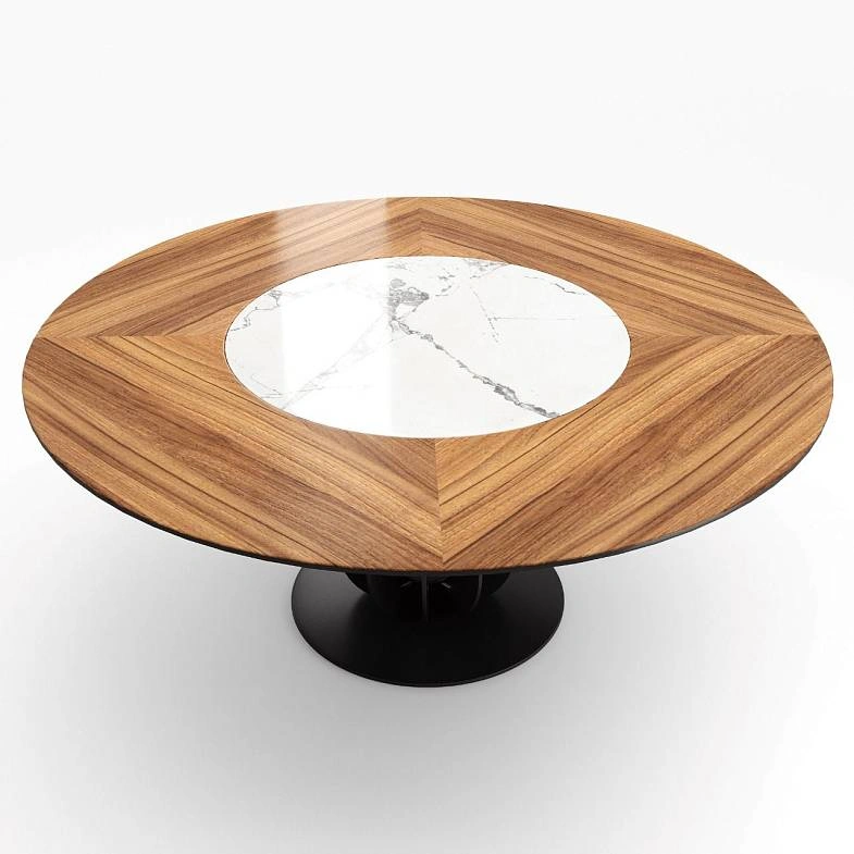Круглый стол Soho с опорой из металла черного цвета выглядит современным и стильным. Комбинация шпона и керамики в столешнице добавляет привлекательный контраст и функциональность. Такой дизайн может подходить для различных интерьеров, включая современные, минималистичные, или индустриальные стили.