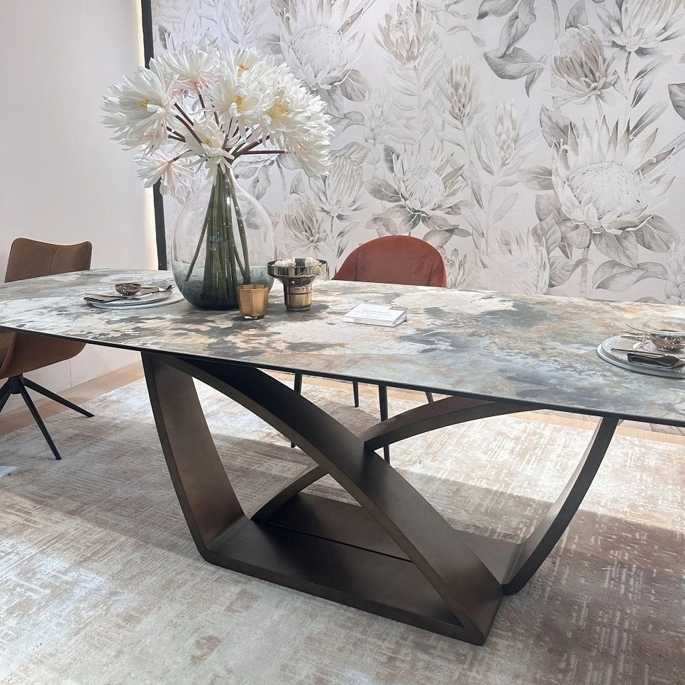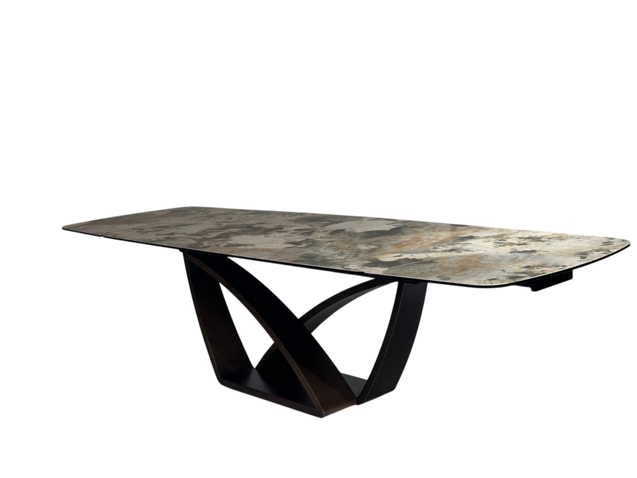 Испанская матовая керамика в цвете серо-коричневый мрамор, толщина столешницы 13 мм (3 мм керамика + 10 мм стекло), не царапается, не впитывает загрязнения, термостойкая. Рисунок вставок может не совпадать и не являться продолжением рисунка основной столешницы.