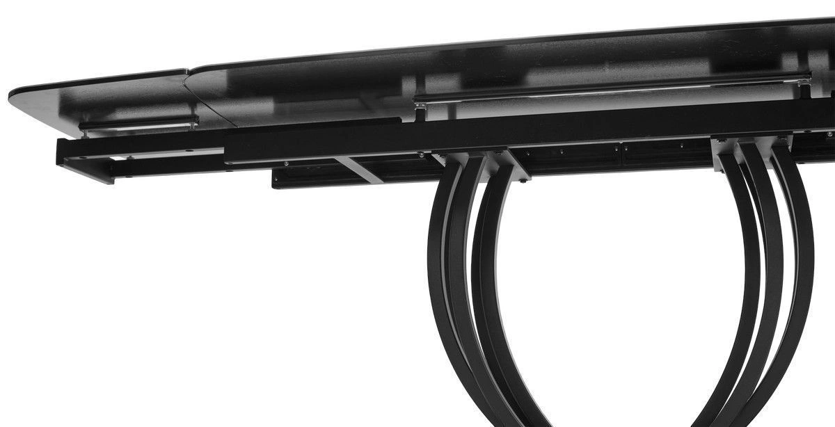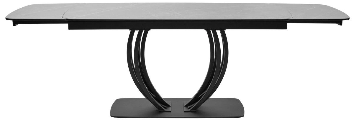 Итальянская матовая керамика в цвете серый мрамор с отражающими свет прожилками, толщина столешницы 13 мм (3 мм керамика + 10 мм стекло), не царапается, не впитывает загрязнения, термостойкая. Двухсторонняя торцевая система раскладывания, две независимые вставки по краям по 40 см позволяют увеличить длину столешницы на 200 или 240 см при необходимости.