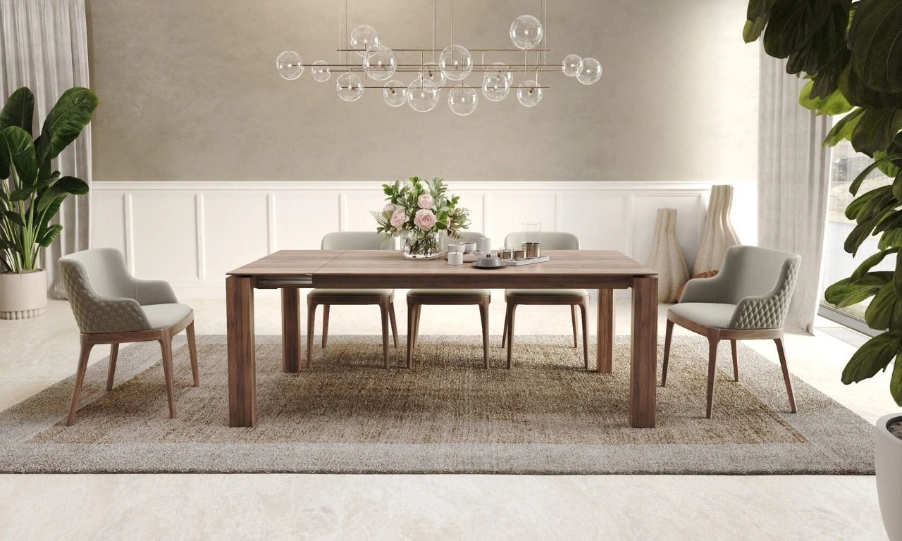 Прямоугольная форма раскладного стола Aron идеально подходит для современных интерьеров, обеспечивая достаточное пространство для комфортного размещения гостей и семейных трапез. Столешница выполнена из шпона, что придает изделию элегантный внешний вид и делает его устойчивым к царапинам и другим механическим повреждениям. Столешница также обеспечивает легкость в уходе, не требуя особых усилий для поддержания чистоты.