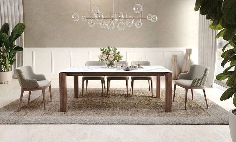 Прямоугольная форма раскладного стола Aron идеально подходит для современных интерьеров, обеспечивая достаточное пространство для комфортного размещения гостей и семейных трапез. Столешница выполнена из матовой керамики 6 мм, что придает изделию элегантный внешний вид и делает его устойчивым к царапинам и другим механическим повреждениям. Столешница также обеспечивает легкость в уходе, не требуя особых усилий для поддержания чистоты.