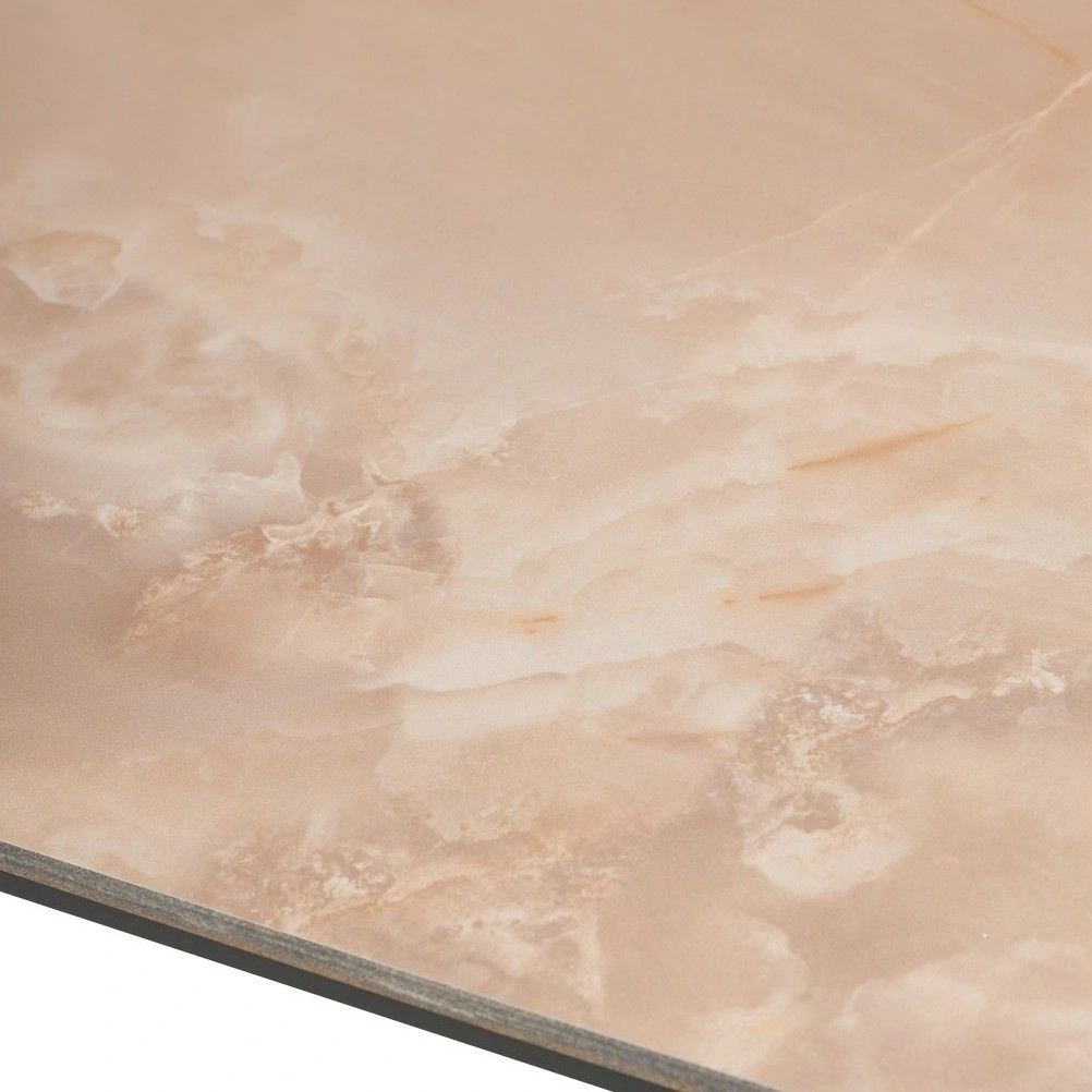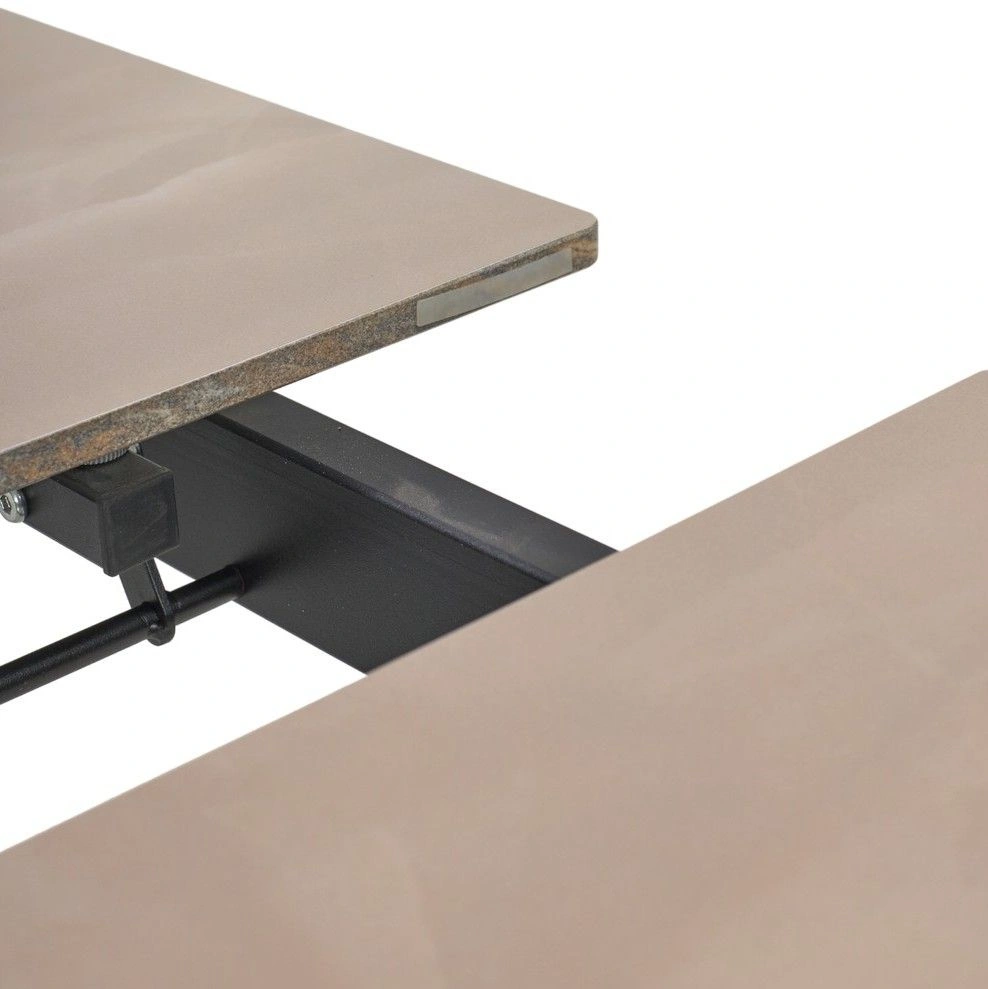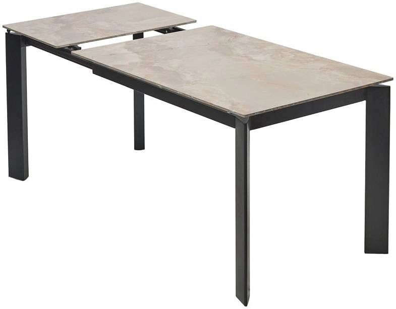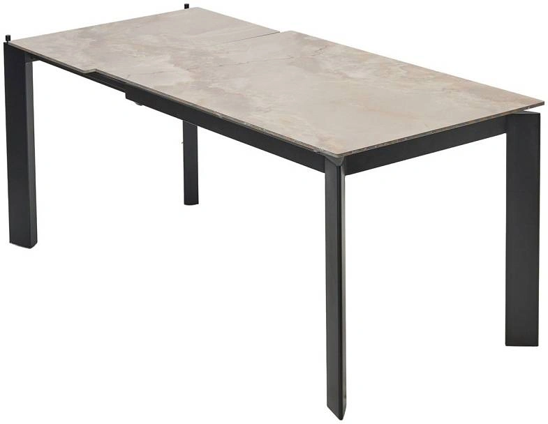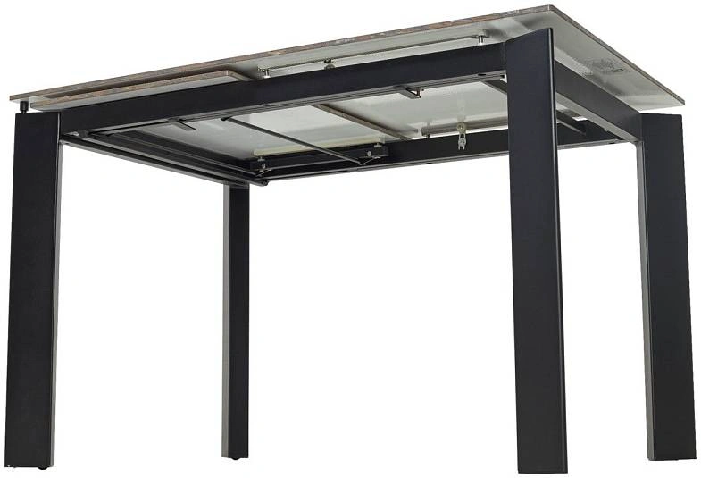 Вставка прямоугольного стола Dogma выдвигается на 50 см с торца вместе с ножками со встроенными колесами, не царапающими пол, что позволяет быстро и легко увеличить длину столешницы до 170 см. Рисунок вставки может не совпадать и не являться продолжением рисунка основной столешницы. Столешница из монолитной керамической плиты, глянец, толщина 11 мм, не царапается, не впитывает жидкость, легко моется, не боится перепадов температур.