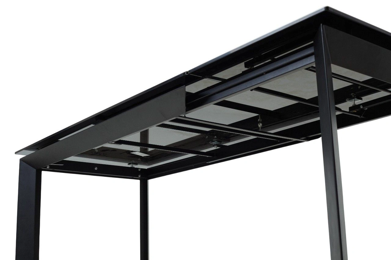 Основание стола - металл, цвет - черный, ножки стола расположены по углам столешницы под углом.