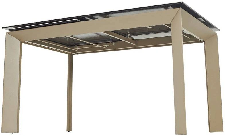 Основание стола - металл, цвет - тауп, ножки стола расположены по углам столешницы под углом.