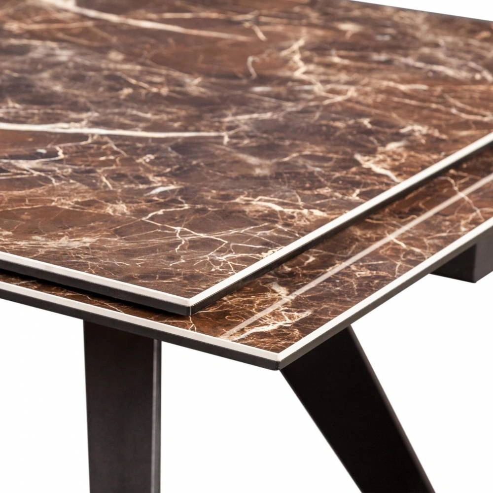 Столешница выполнена из керамической плиты цвета черный мрамор, имитирующей рисунок натурального камня. Каждый стол уникален благодаря рисунку керамической столешницы. Керамическая плита имеет толщину 5 мм и соединена с плитой из закалённого стекла толщиной 8 мм, то есть общая толщина столешницы составляет 13 мм. Керамическая столешницы имеет глянцевую поверхность. Одним из основных достоинств является повышенная устойчивость к царапинам и истиранию. Столешница из керамики устойчива к перепадам температуры и химическому воздействию. Её легко чистить, она очень гигиенична, так как не впитывает жидкости и не выделяет вредных веществ.