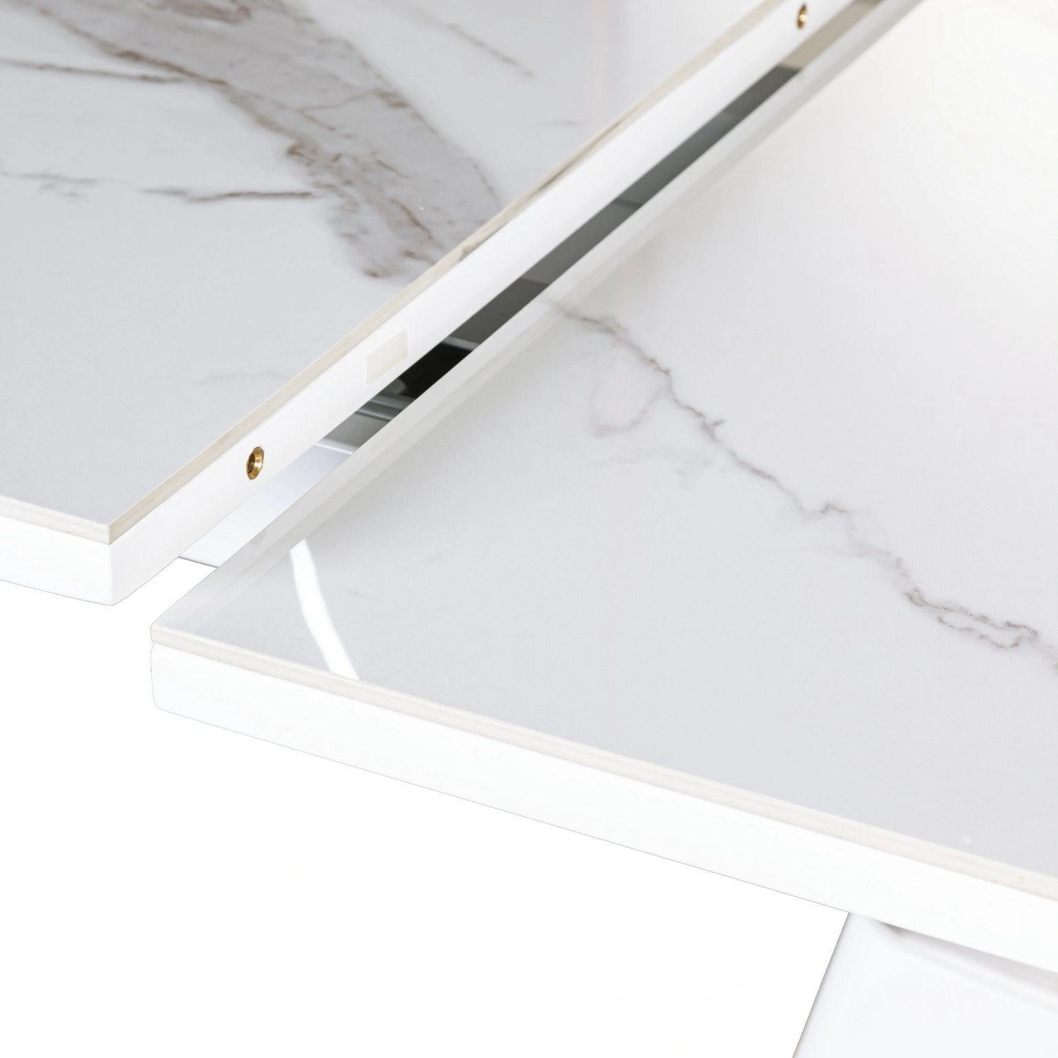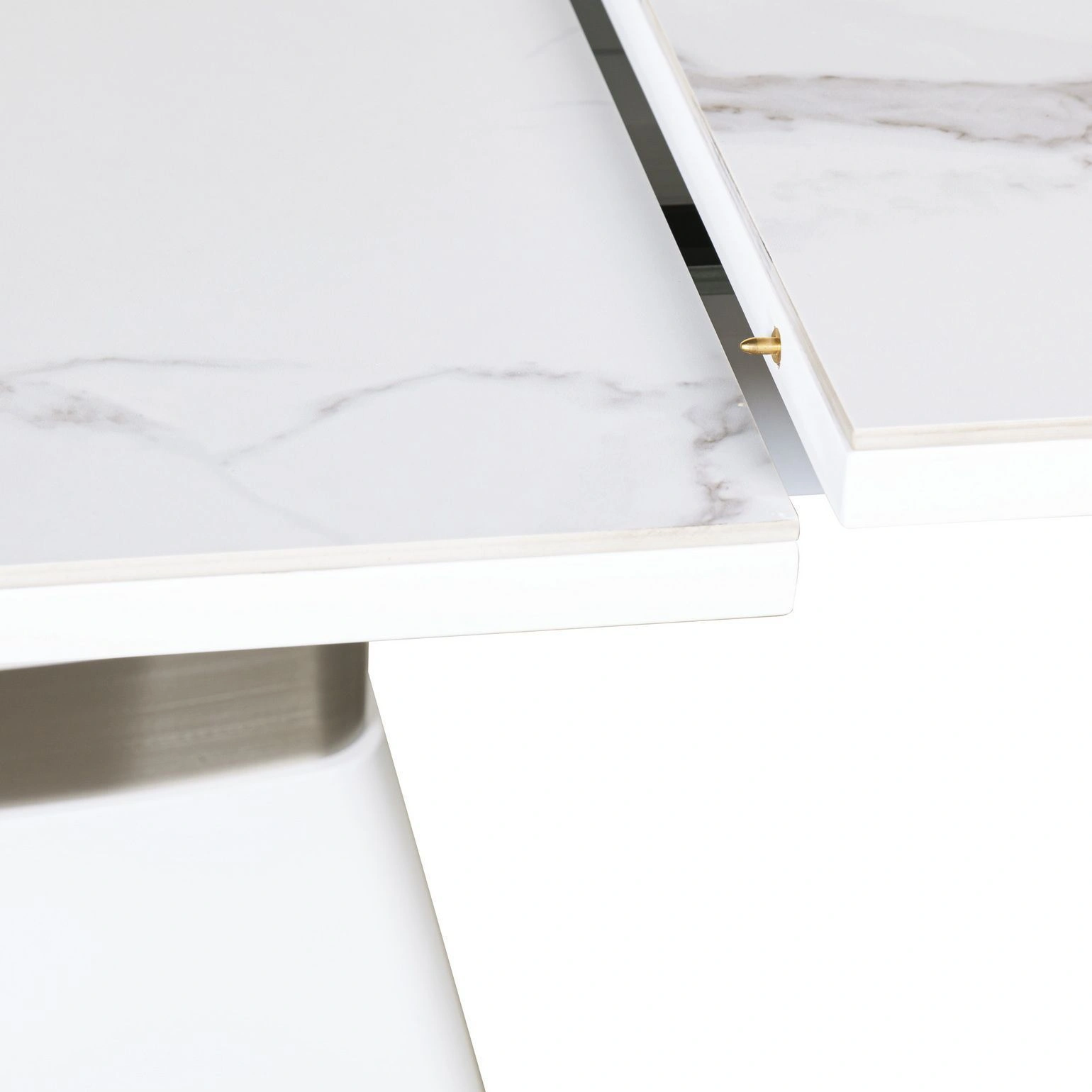 Стол оснащен современным раздвижным механизмом, благодаря которому площадь стола моментально может быть увеличена на 40 см. Нужно потянуть за края столешницы в стороны, открыв поворотные центральные вставки. Их нужно потянуть вверх и повернуть, сдвинуть столешницы. Для надёжности механизм фиксируется дополнительным зажимом.Эта функция невероятна удобна в случаях, когда обеденный стол, используемый ежедневно, необходим превратить в место сбора друзей и родственников.