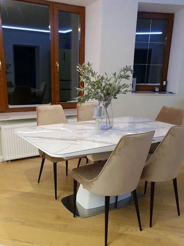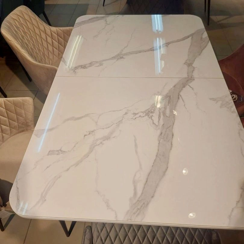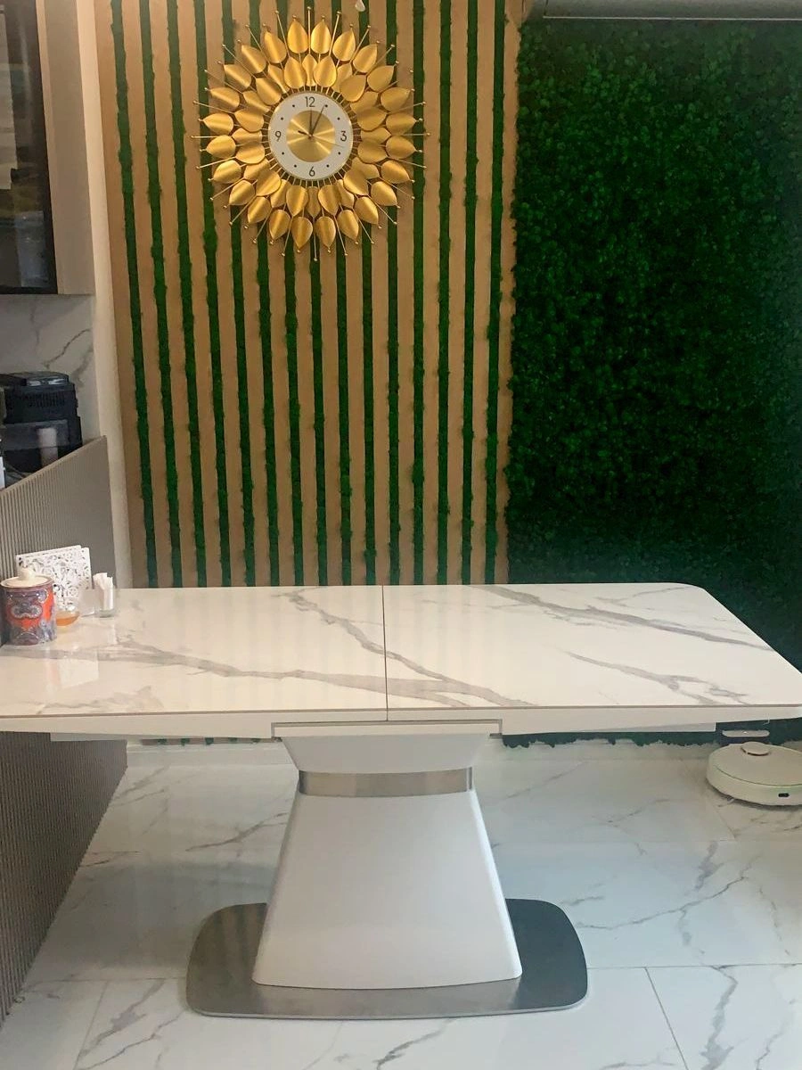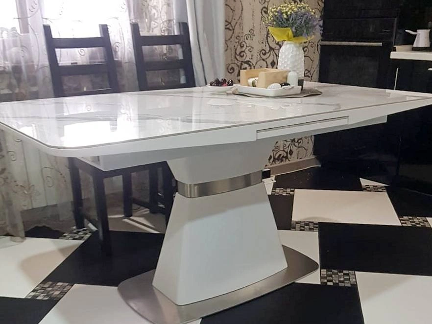 Стол оснащен современным раздвижным механизмом, благодаря которому площадь стола моментально может быть увеличена на 40 см. Нужно потянуть за края столешницы в стороны, открыв поворотные центральные вставки. Их нужно потянуть вверх и повернуть, сдвинуть столешницы. Для надёжности механизм фиксируется дополнительным зажимом.Эта функция невероятна удобна в случаях, когда обеденный стол, используемый ежедневно, необходим превратить в место сбора друзей и родственников.