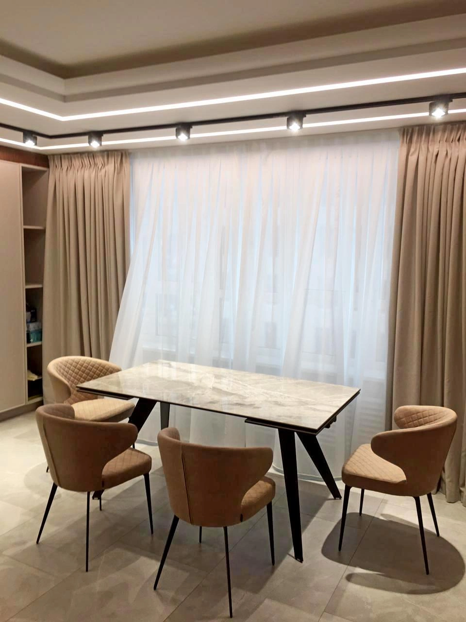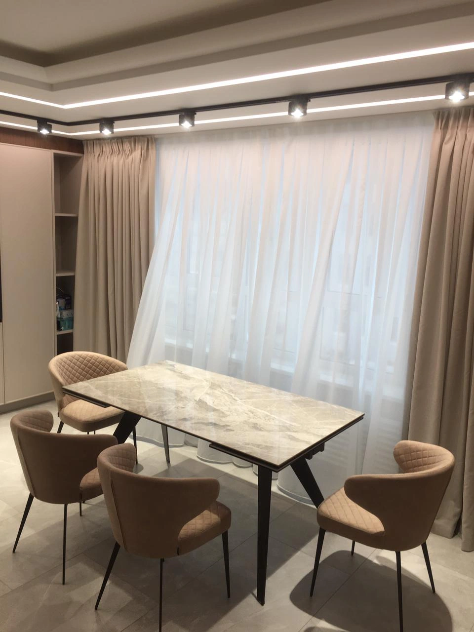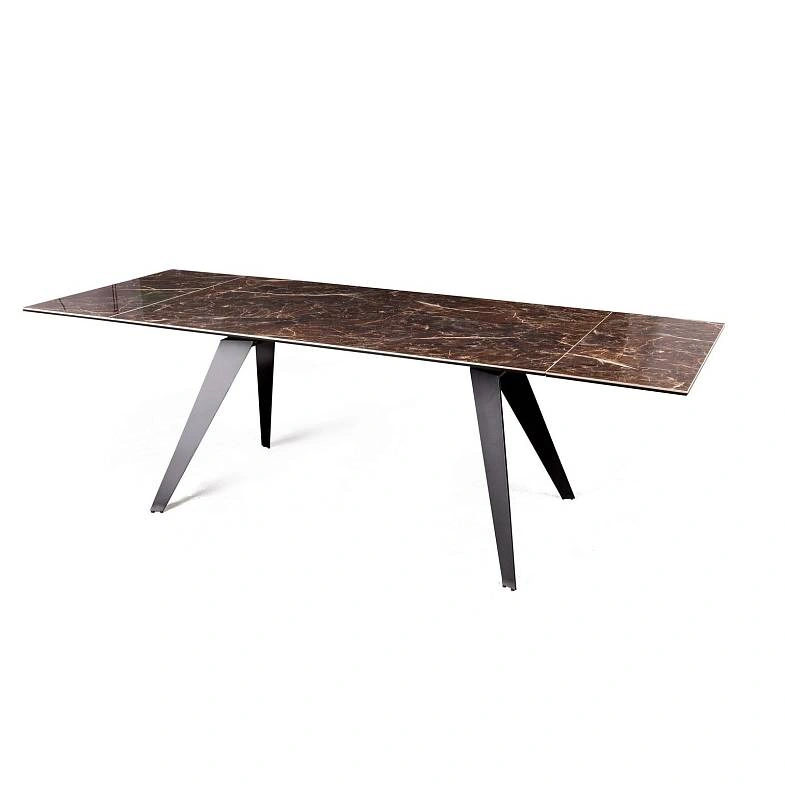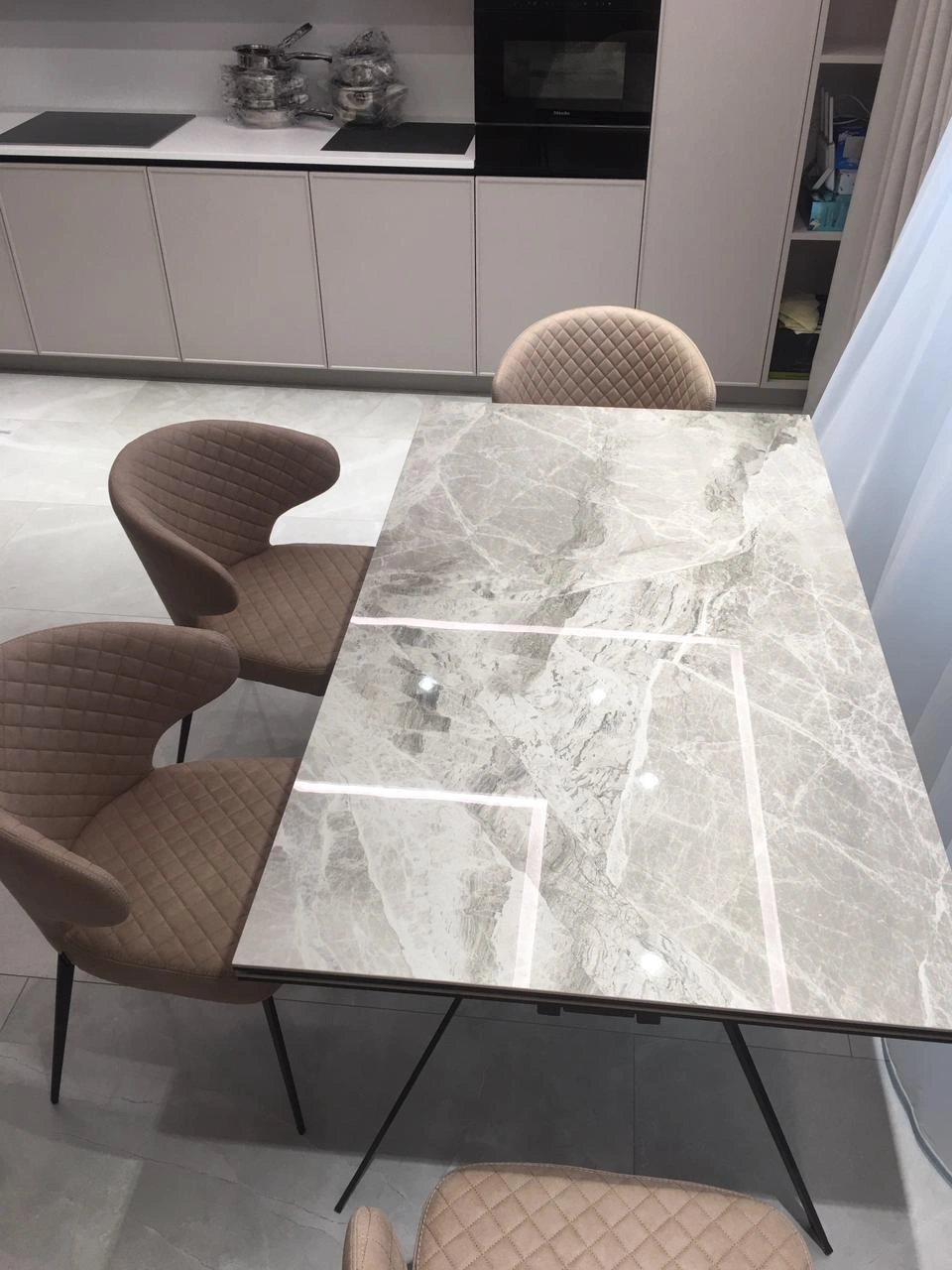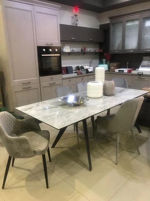 Элегантный стол с керамической столешницей обязательно станет центральным элементом обеденной зоны или кухни. Металлические ножки темно-серого цвета выглядят грациозно и контрастно на фоне светлой столешницы. Стол основателен и надежен благодаря прочным материалам, из которых выполнен: столешница из керамической плиты и стальной каркас и ножки. При этом стол смотрится гармонично, сдержанно и невероятно стильно.
