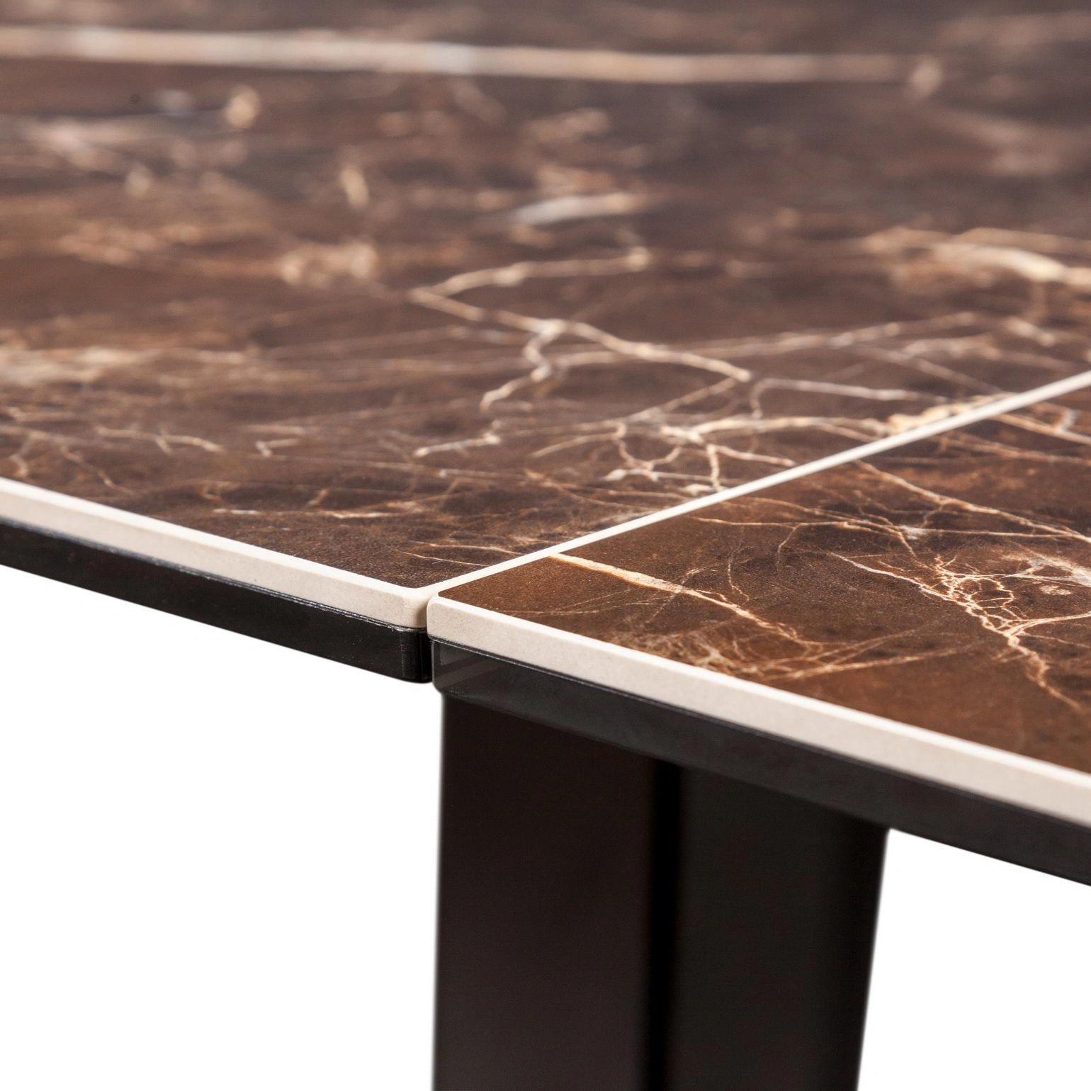 Столешница выполнена из керамической плиты светло-серого цвета, имитирующей рисунок натурального камня. Каждый стол уникален благодаря рисунку керамической столешницы. Керамическая плита имеет толщину 5 мм и соединена с плитой из закалённого стекла толщиной 8 мм, то есть общая толщина столешницы составляет 13 мм. Керамическая столешница имеет глянцевую поверхность. Одним из основных достоинств является повышенная устойчивость к царапинам и истиранию. Столешница из керамики устойчива к перепадам температуры и химическому воздействию. Её легко чистить, она очень гигиенична, так как не впитывает жидкости и не выделяет вредных веществ.