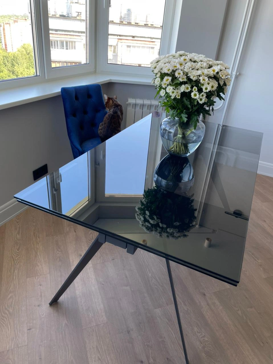 Стол прямоугольной формы оснащён раздвижным механизмом, который позволяет при необходимости увеличить полезную площадь столешницы на 80 см. Такая функция незаменима для небольших пространств, где нет возможности поставить большой обеденный стол, но при этом нужно время от времени размещать за столом гостей и родственников. Две боковые панели спрятаны по бокам стола под основной столешницей. Это очень удобно, так как вы можете увеличивать длину постепенно, по необходимости, сразу на 80 см или только на 40 см с одной стороны. Разложить стол очень просто: нужно потянуть дополнительную панель на себя и поднять ее. Процесс трансформации невероятно удобен и прост.