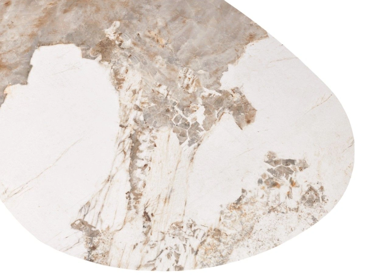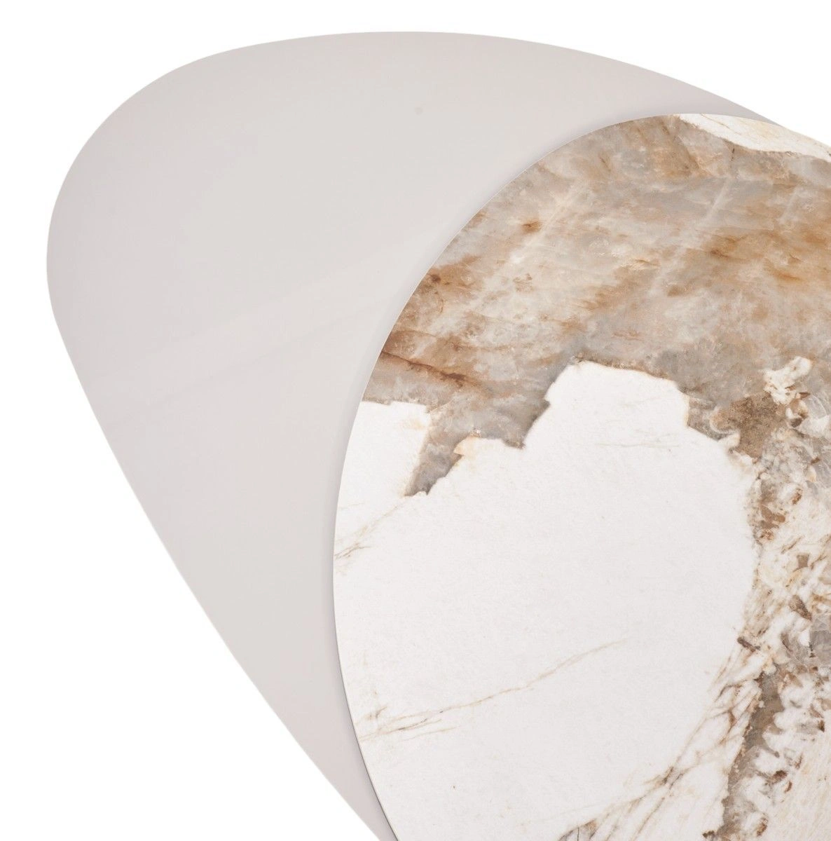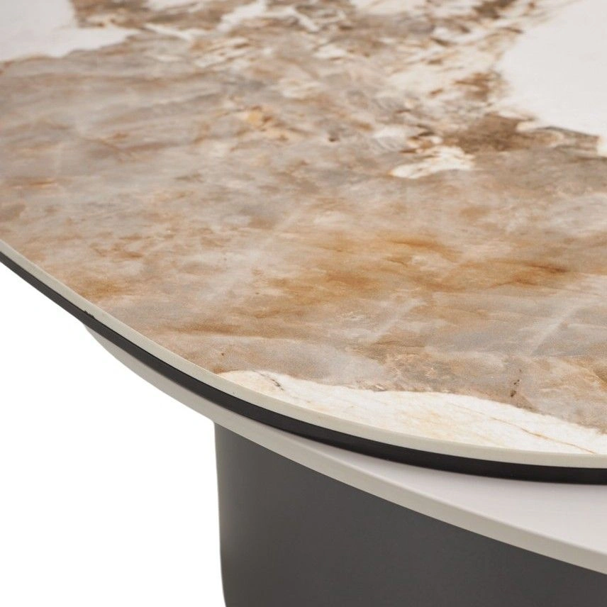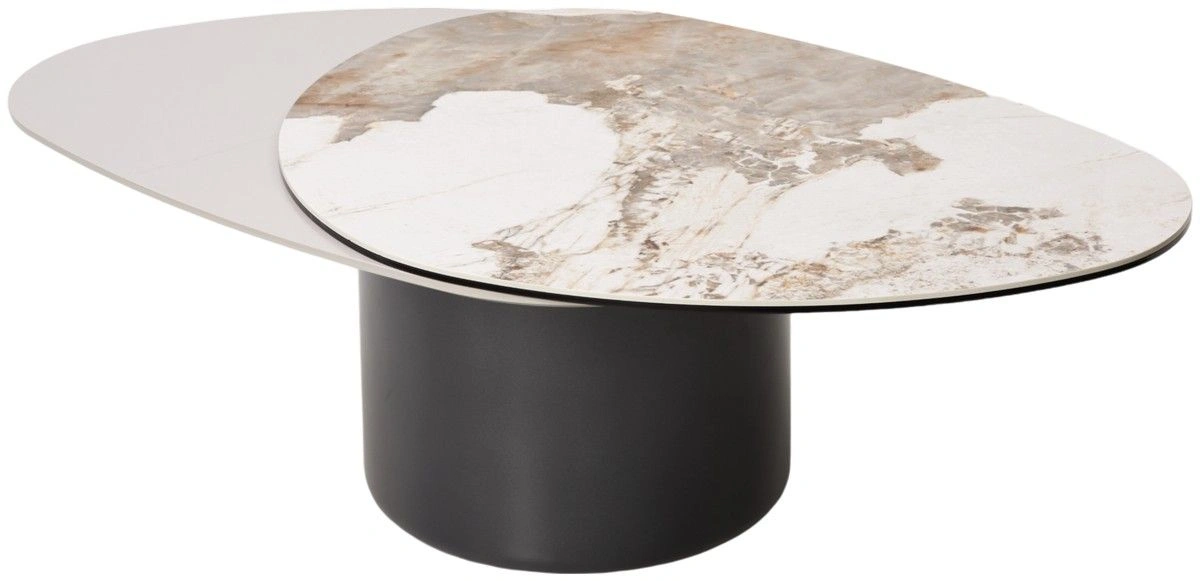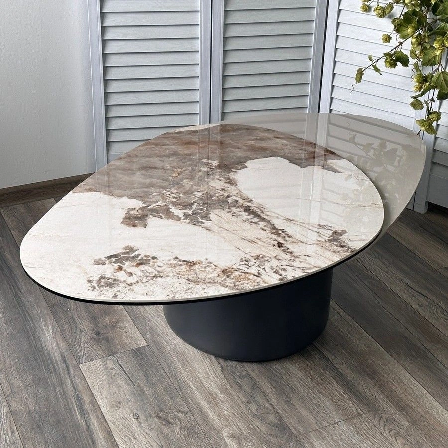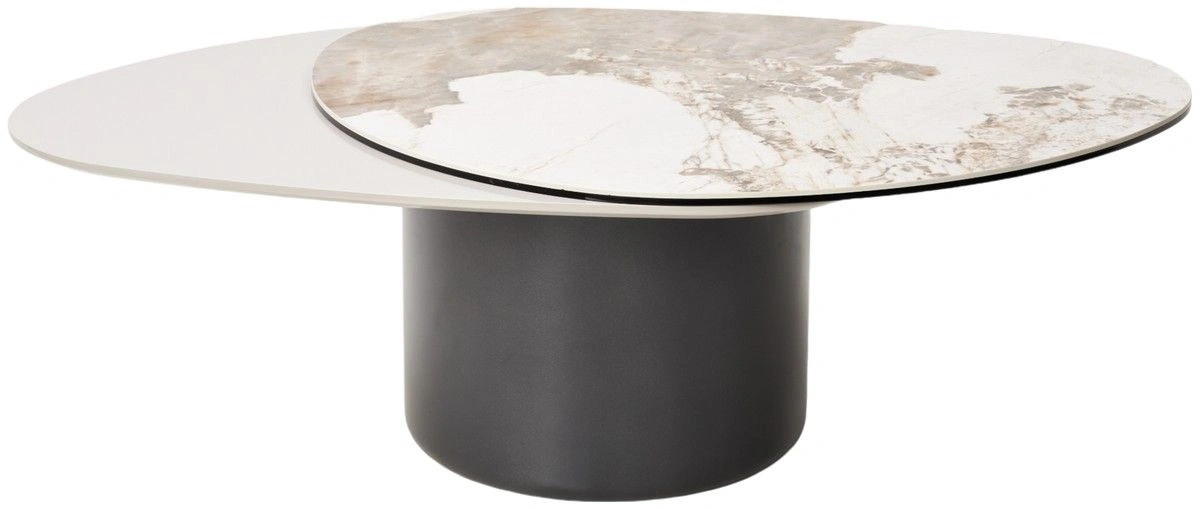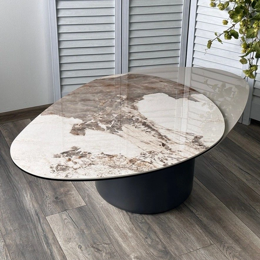Дизайнерский стол кофейный Nikolas с глянцевой керамической поверхностью. Комбинированная столешница: 1-ая столешница - глянцевая керамика на стекле, толщина 14 мм (6 мм керамика + 8 мм закаленное стекло) , 2-аф столешница - МДФ, окрашенный в цвет латте. Основание стола – окрашенный МДФ, цвет – темно-серый. Упакован в 2 коробки.