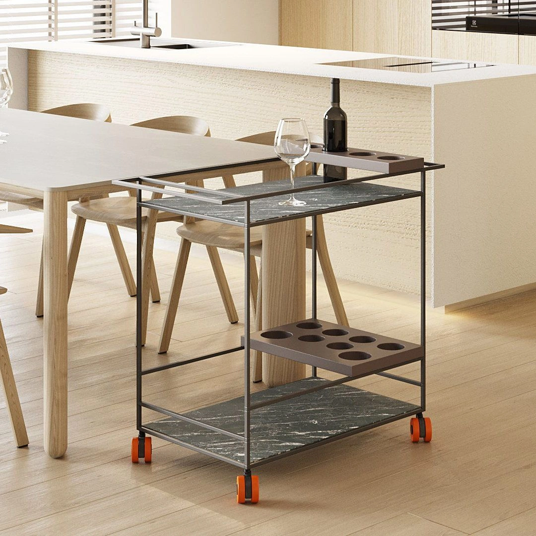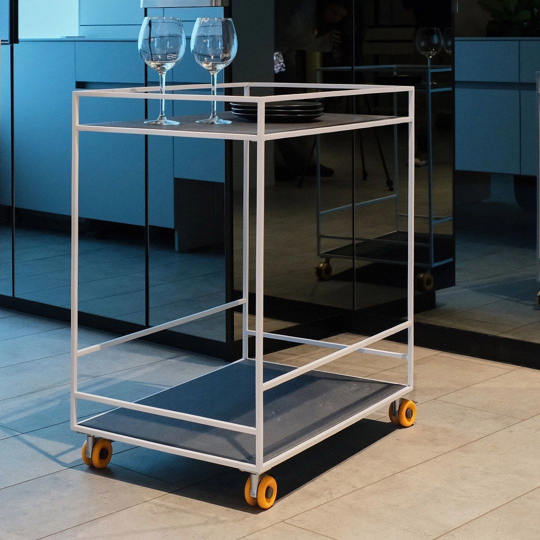 ХранениеСервировочный стол Serve — стильное и функциональное решение для дома. Металлический каркас доступен в трех цветах: белый, темно-серый и черно-серый. Возможна покраска каркаса в любой оттенок RAL. Полки из износостойкой компакт-плиты. Столик оснащен алюминиевыми оранжевыми колесиками с тормозом.