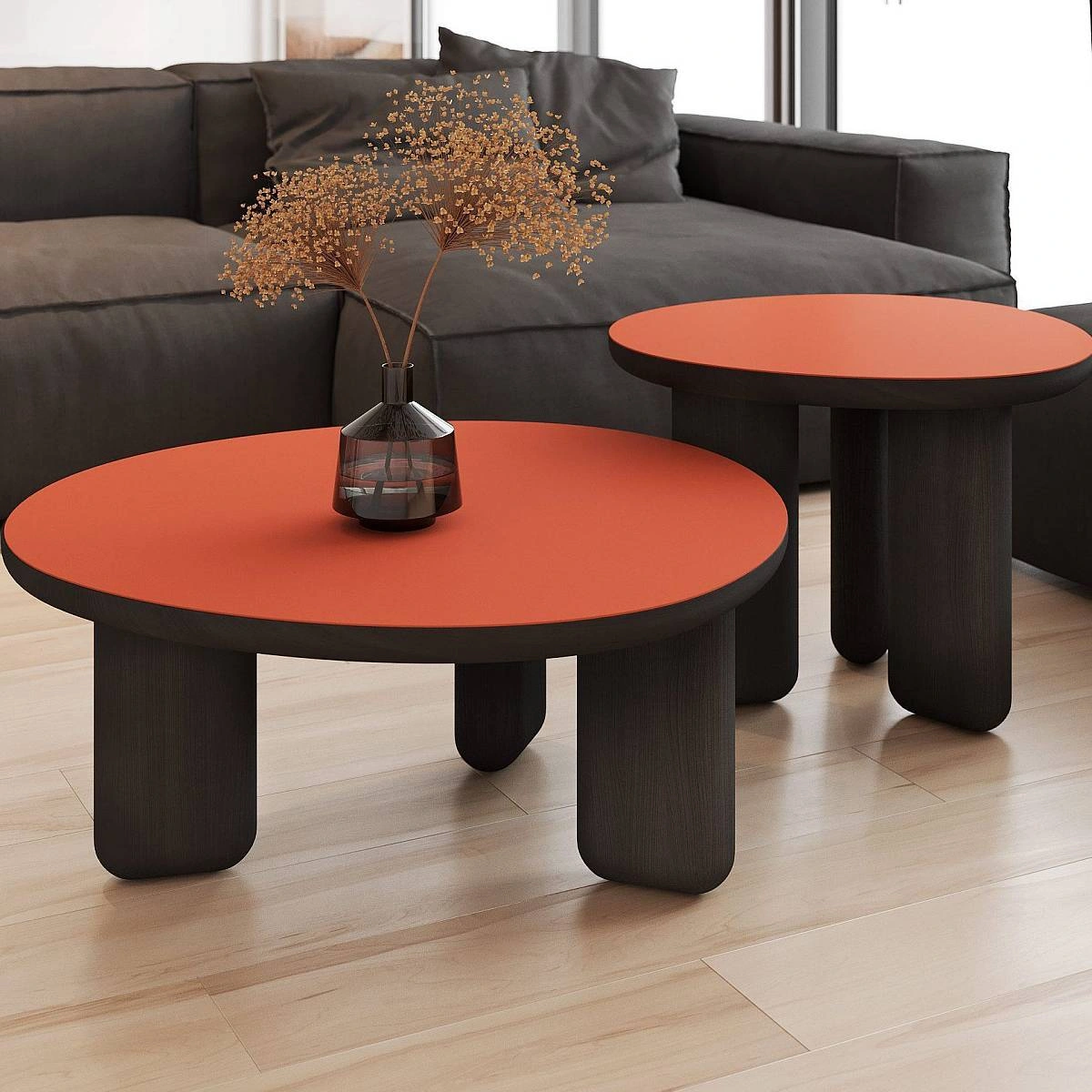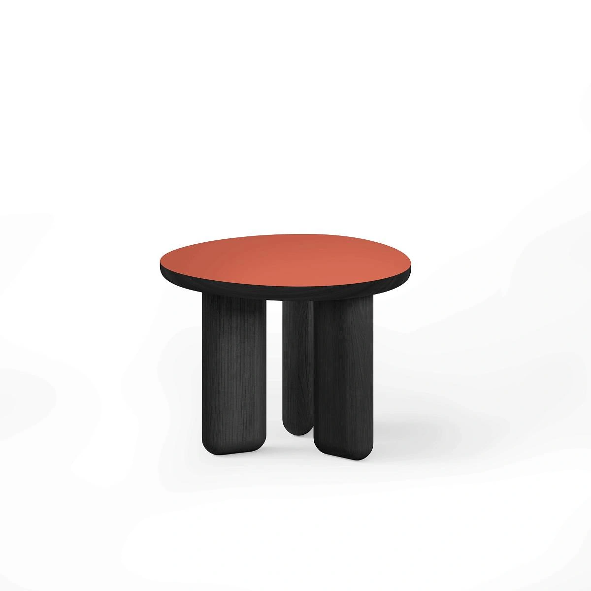 Столешница со скругленными углами диаметром 600 мм и толщиной 40 мм выполнена из МДФ, облицованного суперматовым пластиком fenix красно-оранжевого цвета.