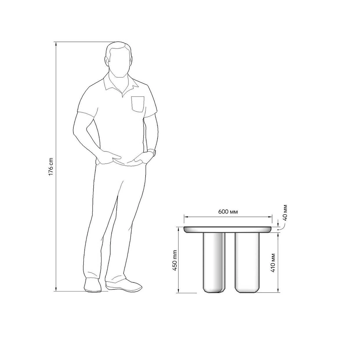 Столешница со скругленными углами диаметром 600 мм и толщиной 40 мм выполнена из МДФ, облицованного суперматовым пластиком fenix серого цвета.