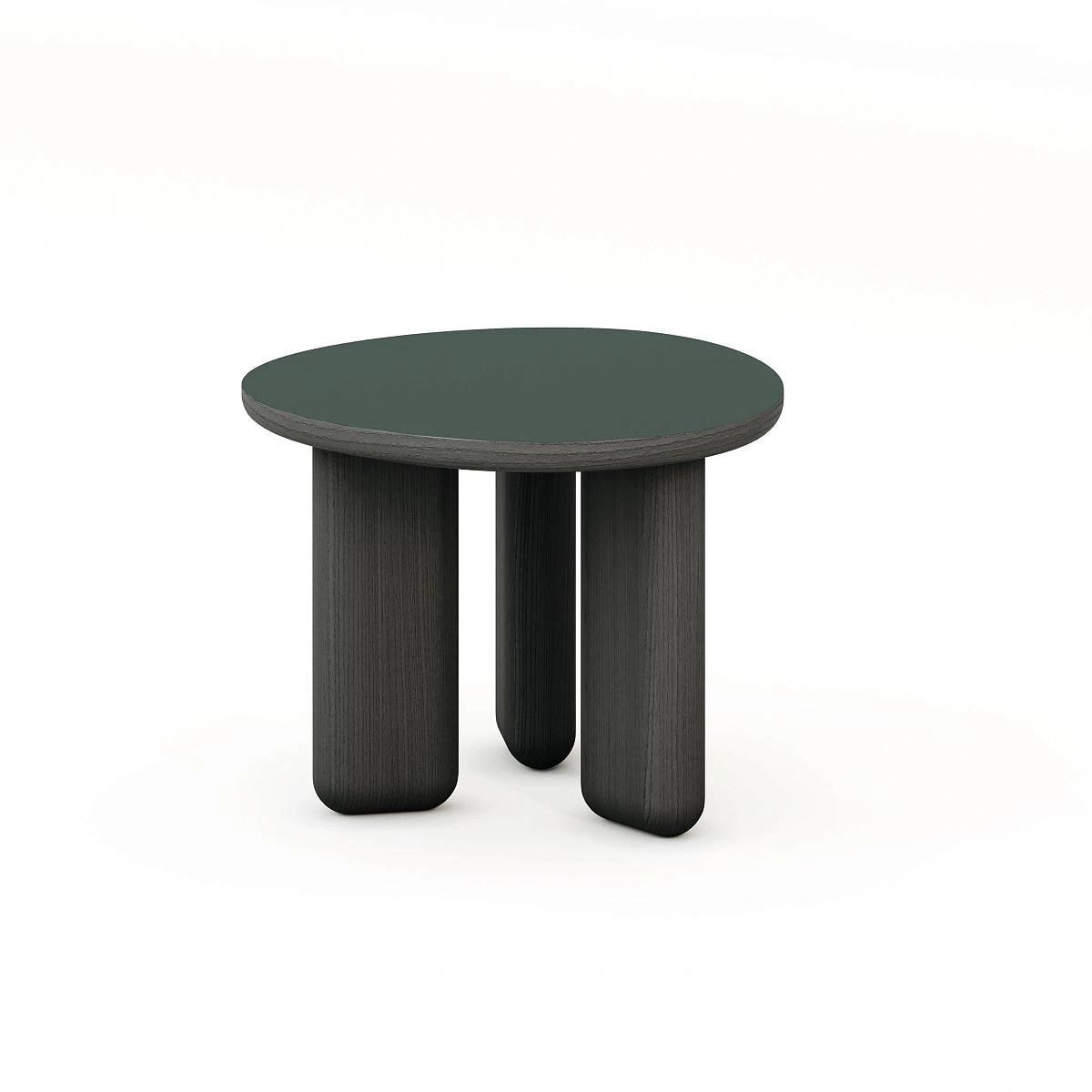 Столешница со скругленными углами диаметром 600 мм и толщиной 40 мм выполнена из МДФ, облицованного суперматовым пластиком fenix темно-зеленого цвета.