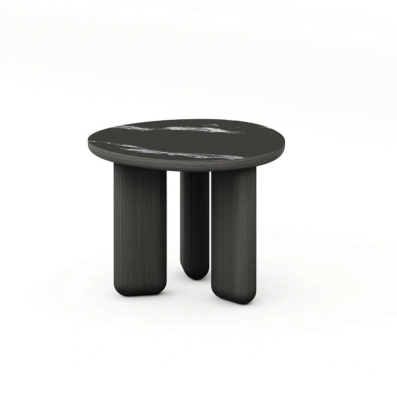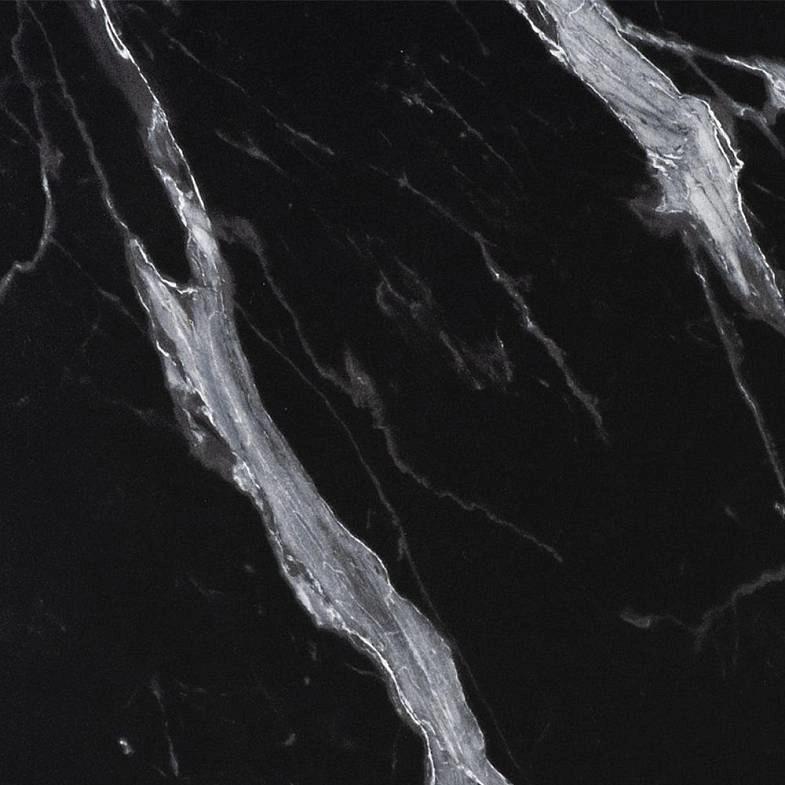 Столешница со скругленными углами диаметром 600 мм и толщиной 40 мм выполнена из МДФ, облицованного пластиком HPL черного цвета с прожилками.