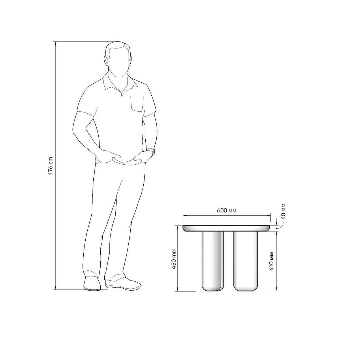 Столешница со скругленными углами диаметром 600 мм и толщиной 40 мм выполнена из МДФ, облицованного пластиком HPL цвета светлый бетон.