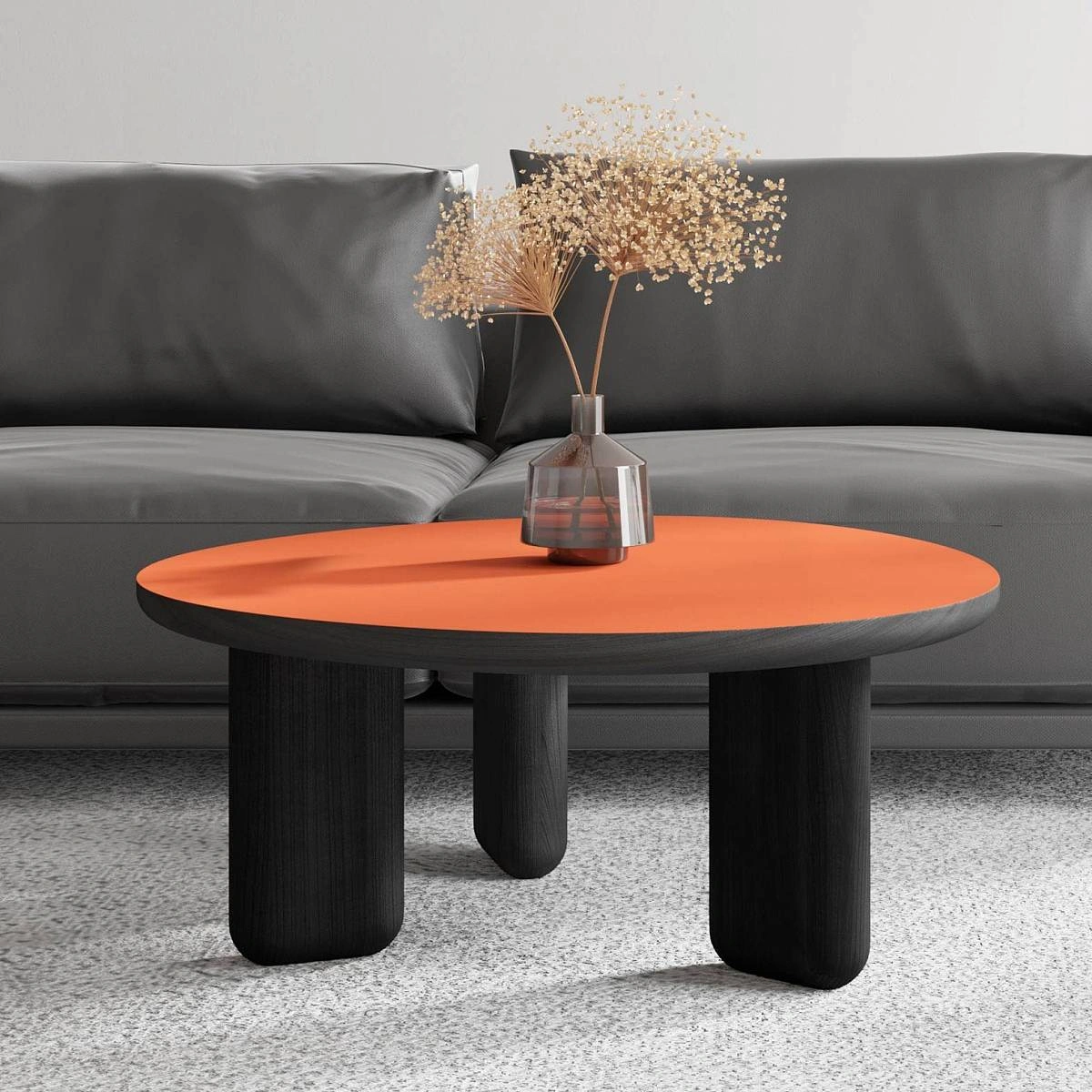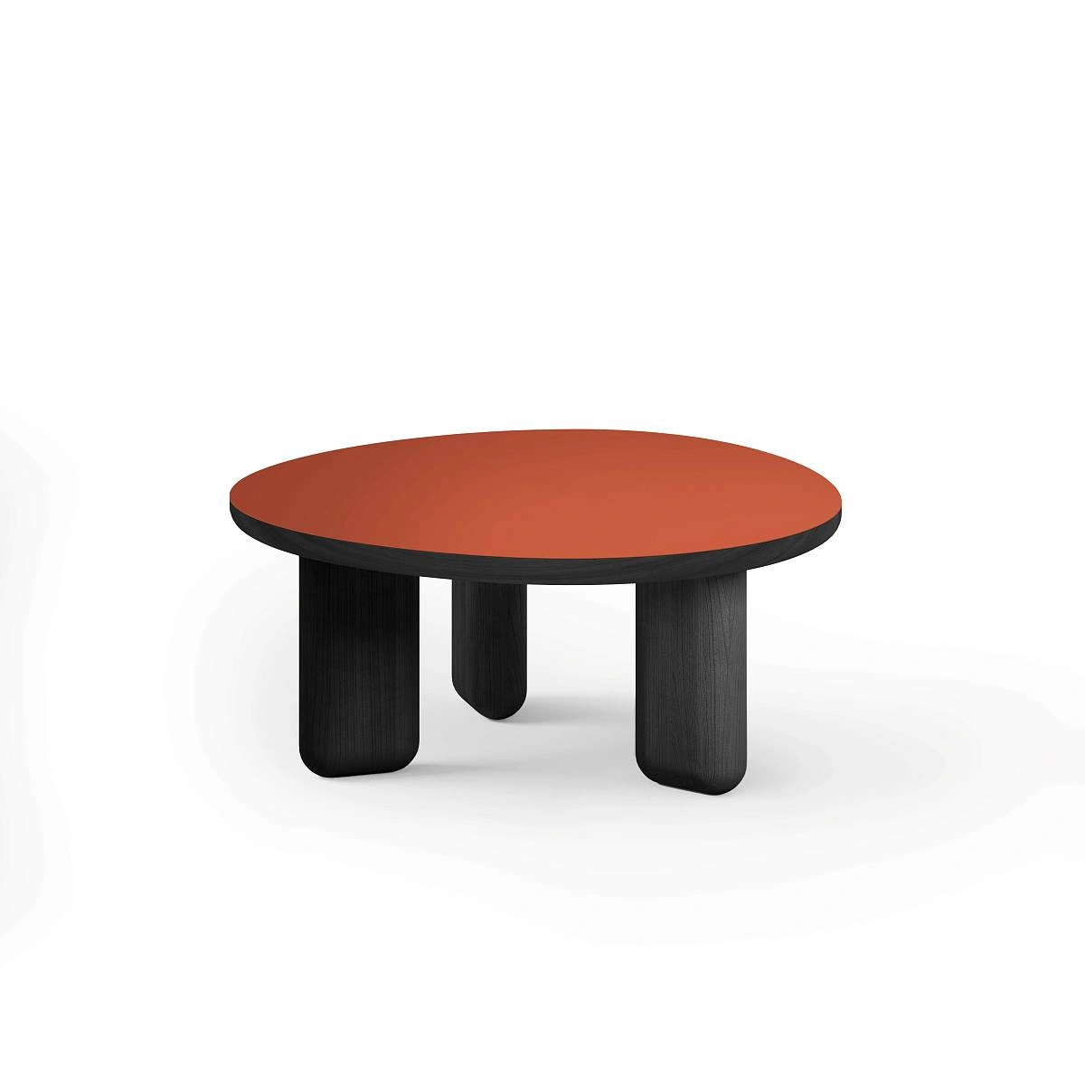 Столешница со скругленными углами диаметром 790 мм и толщиной 40 мм выполнена из МДФ, облицованного суперматовым пластиком fenix красно-оранжевого цвета.