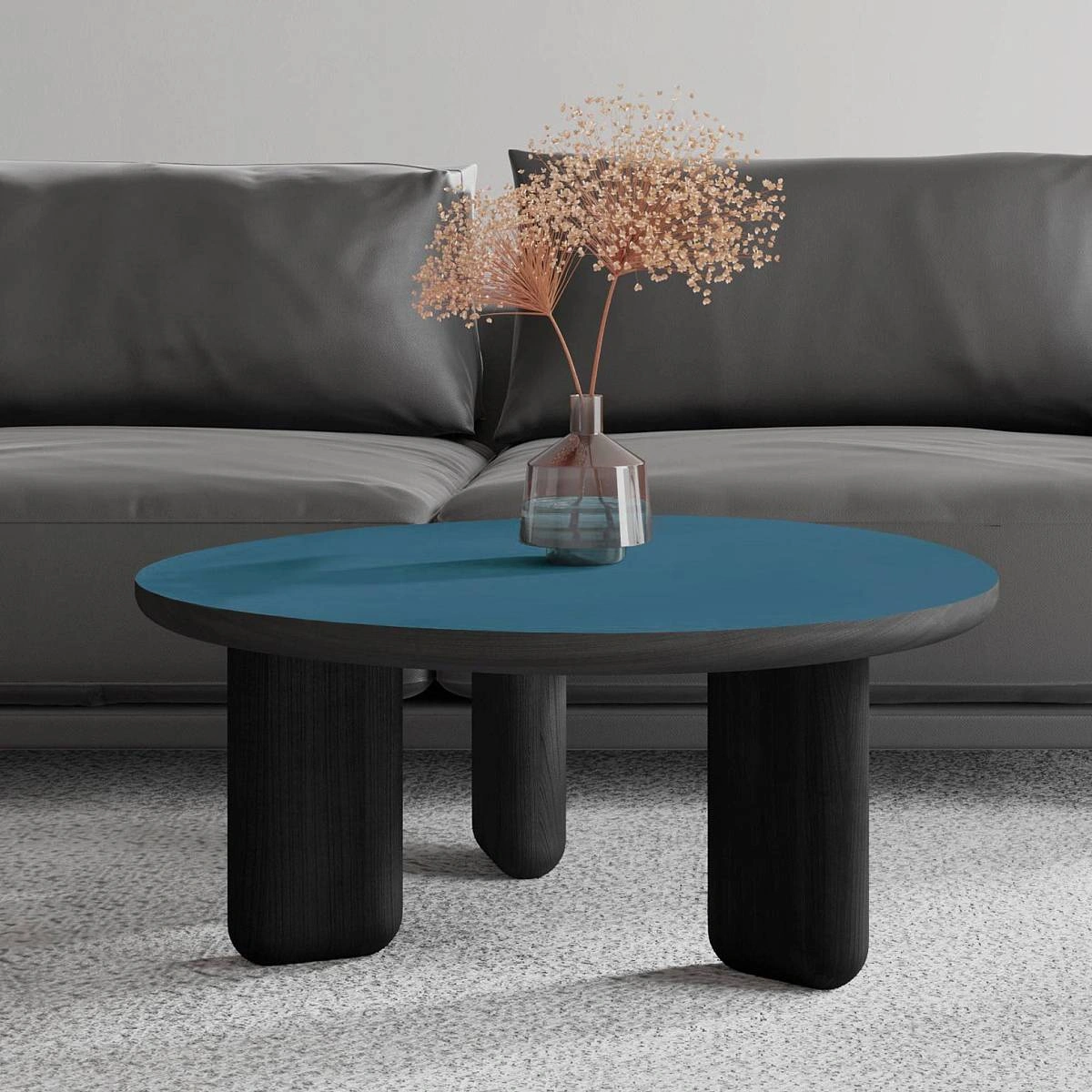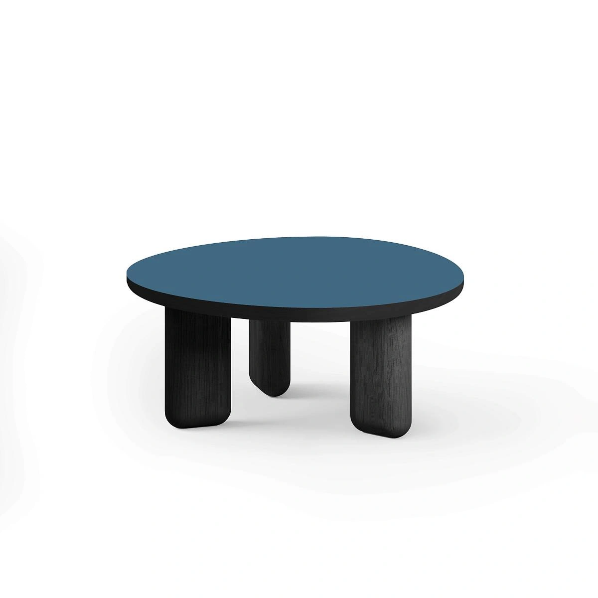 Столешница со скругленными углами диаметром 790 мм и толщиной 40 мм выполнена из МДФ, облицованного суперматовым пластиком fenix синего цвета.