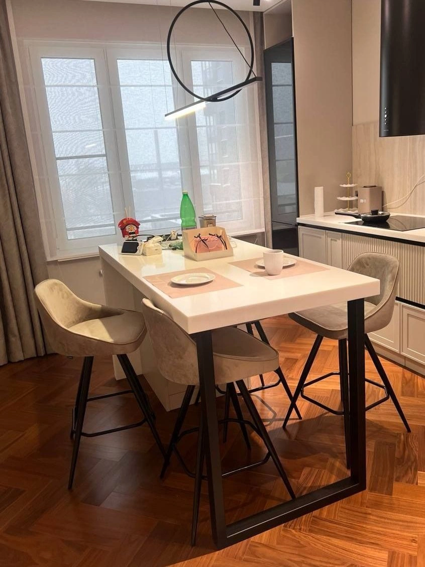 Металлические опоры окрашены в черный матовый цвет, На ножках предусмотрены специальные пластиковые накладки, которые защищают пол от царапин.