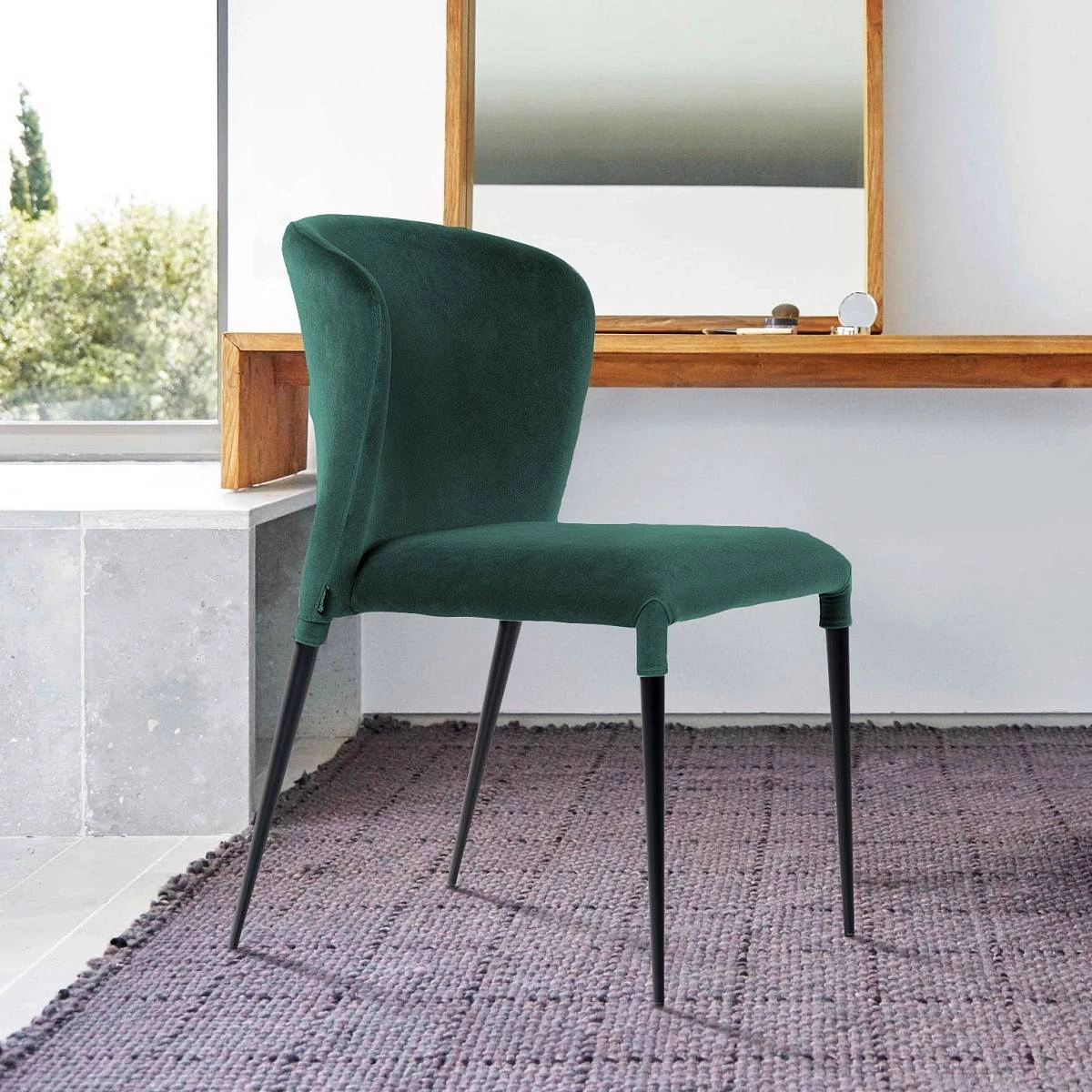 Изюминка стула Albert – невероятно тонкие металлические ножки черного матового цвета, излишне скошенные назад, как часть дизайнерской задумки. На ножках предусмотрены специальные пластиковые накладки, которые придают стулу дополнительную устойчивость и защищают пол от царапин.