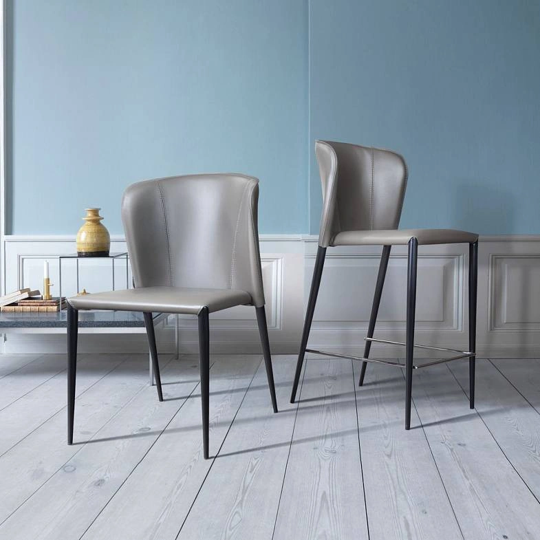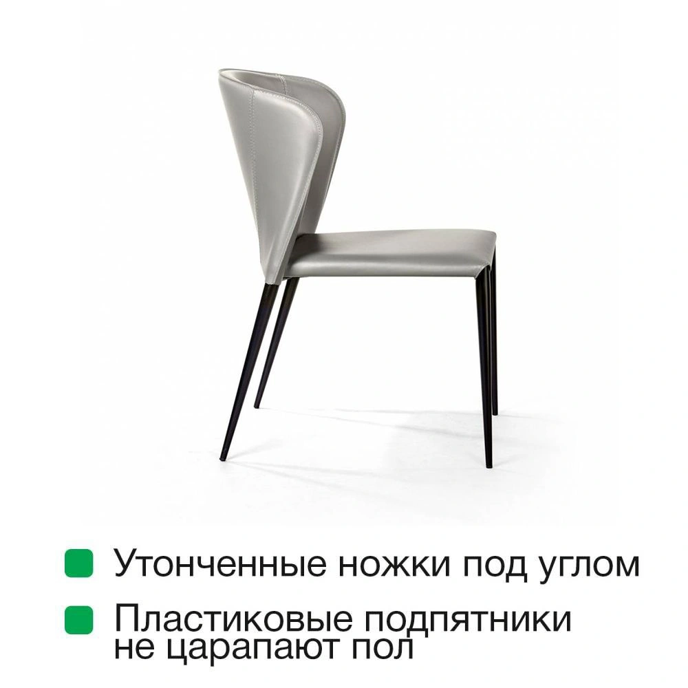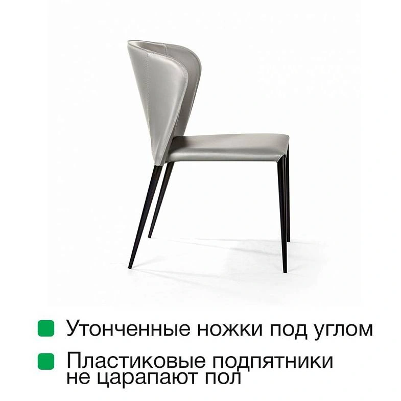 Изюминка стула Albert – невероятно тонкие металлические ножки черного матового цвета, излишне скошенные назад, как часть дизайнерской задумки. На ножках предусмотрены специальные пластиковые накладки, которые придают стулу дополнительную устойчивость и защищают пол от царапин.